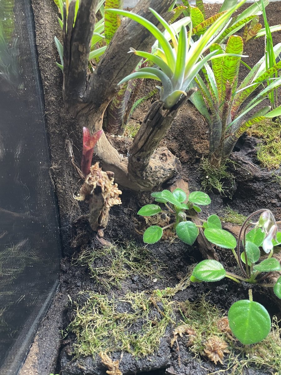 Duurt nog een tijdje, wil ook nog iets bedenken om in de waterpartij te leggen als hulpmiddel dat ze evt uit het water kunnen klimmen als ze erin gaan. De Dendrobates in de andere bak zitten geregeld even in het water, en gaan er via hout of lava stenen weer uit.