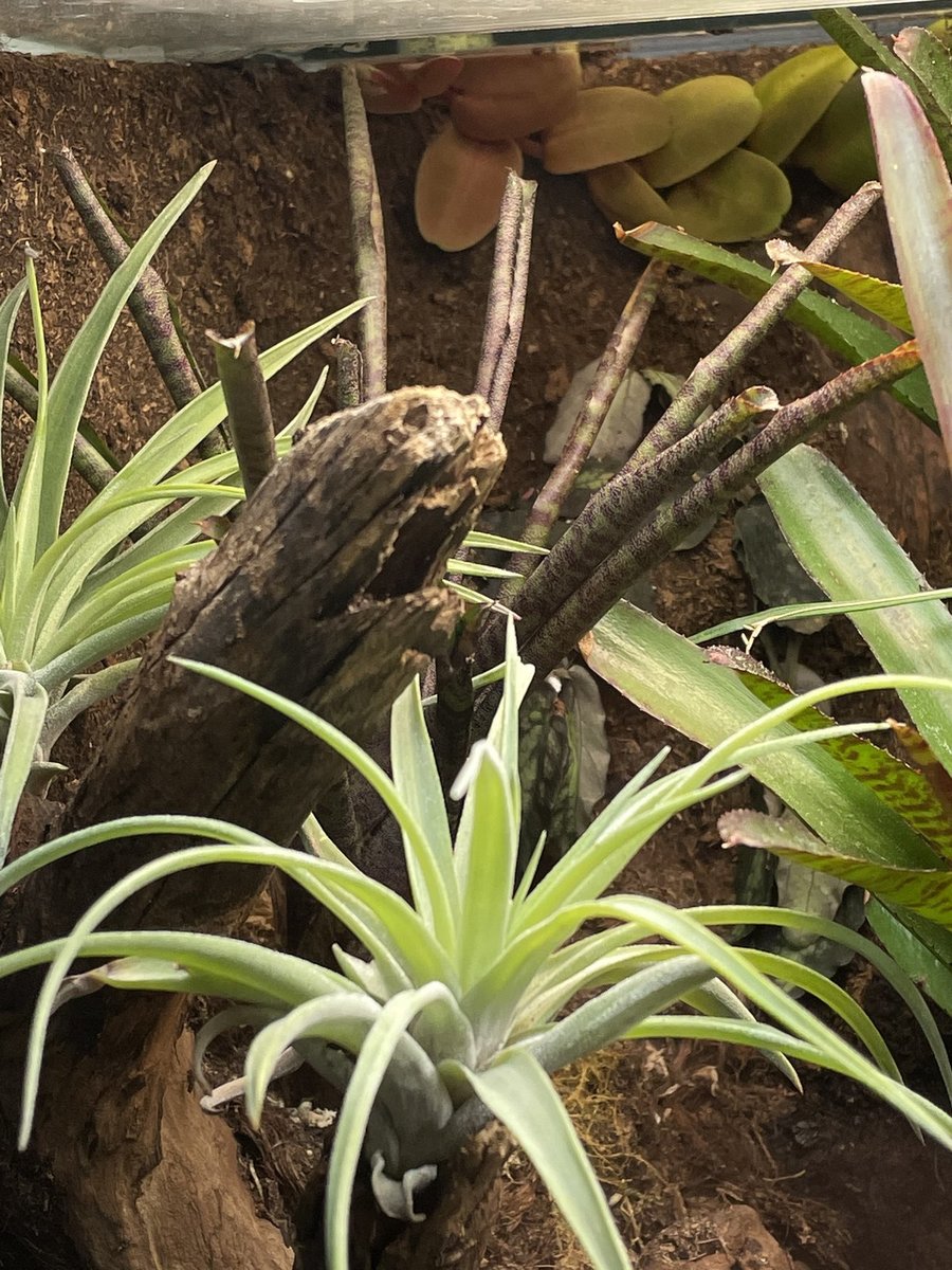 In een ver verleden hebben mijn ouders nog pijlgifkikkers gehad. Ik meen mij ook te herinneren dat dat 1 van hun favoriete plekjes is. Omdat daar water in blijft staan. Denk ik. 😅Ik meen ooit iets gelezen te hebben over kikkers en het hart van bromelia’s, maar ik weet totaal niet meer of dat ook betrekking had op eitjes.