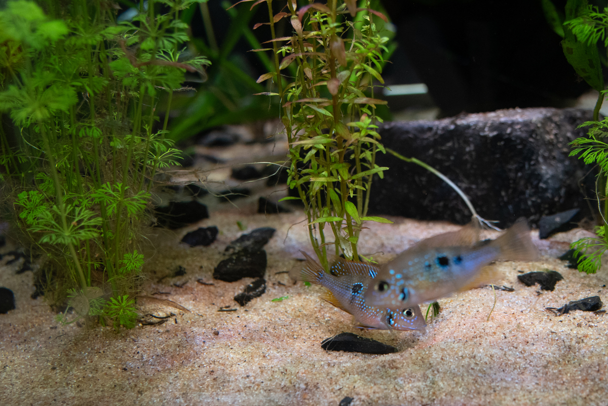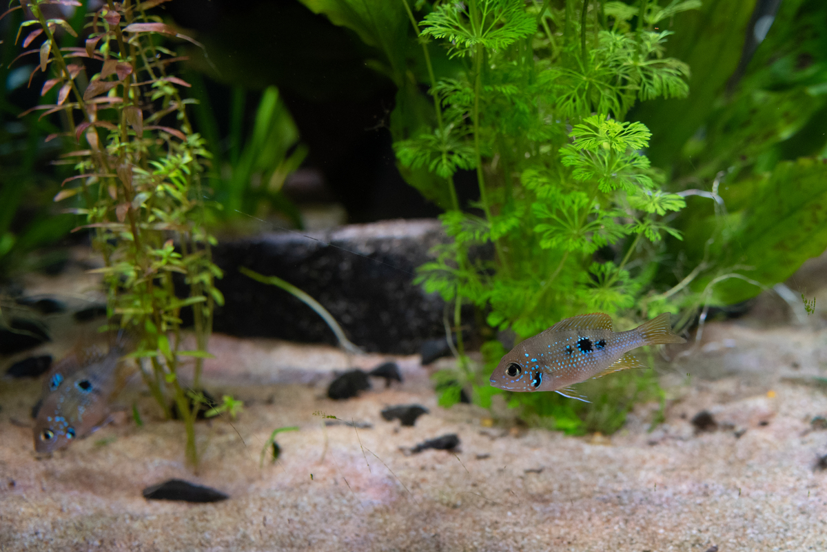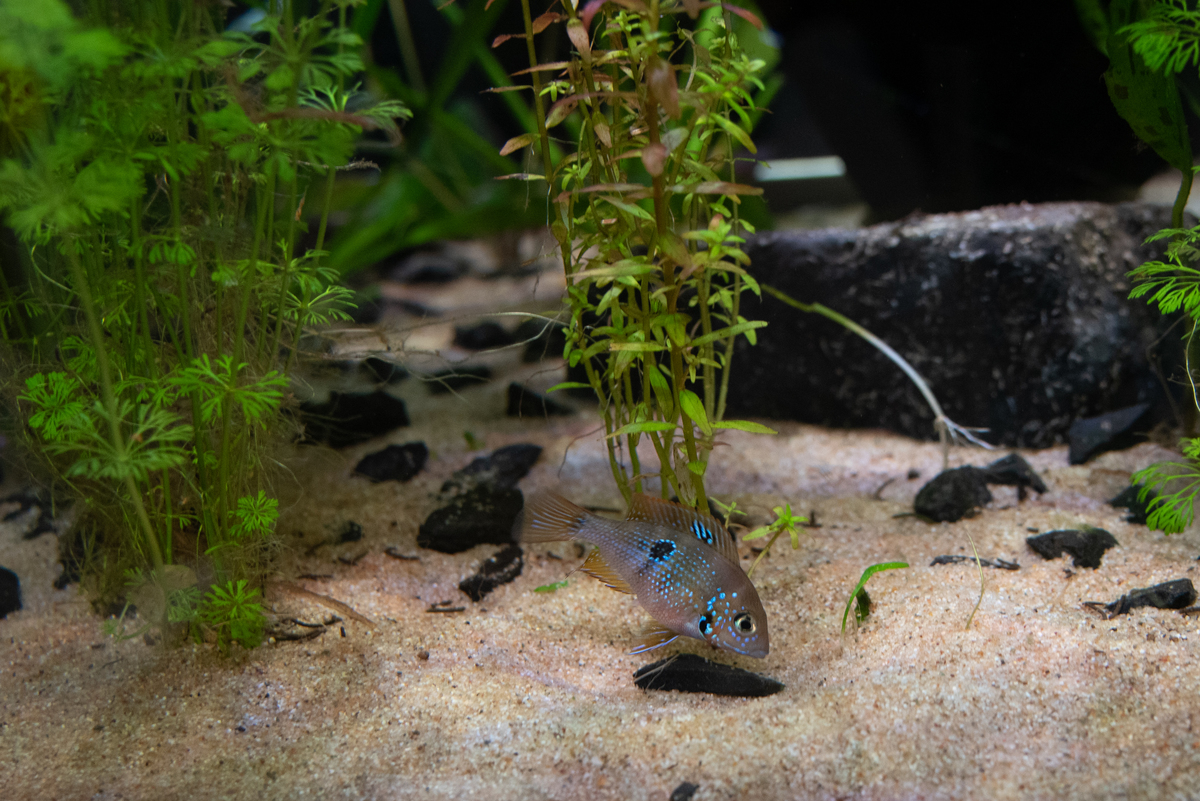 de vrouwtjes hebben dat blauwe vlekje in hun rugvin, zo makkelijkst te onderscheiden. Als ze volwassen zijn krijgt de man ook een duidelijk prominenter (bult)voorhoofd