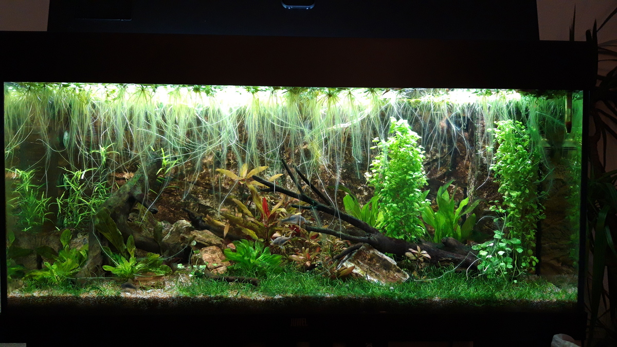 Er is hier en daar wel wat veranderd aan beplanting en grove snoeibeurten. In de zomer nog last gehad van zweefalg wat ik uiteindelijk zonder middeltjes en een schep geduld onder controle heb gekregen. De laatste maanden draait het allemaal wel stabiel, met hier en daar nog wat alg. Ook qua bewoners zwemmen er intussen weer naast de oude Corydoras aeneus ook weer een mooie school roodkopzalmen (H. belehri) en een drietal Apistogramma hongsloi in. Dit is voor deze bak ook het definitieve bestand omdat ik het anders te druk vindt worden. Binnenkort nog wat aanpassingen verrichten qua beplanting en extra hout.