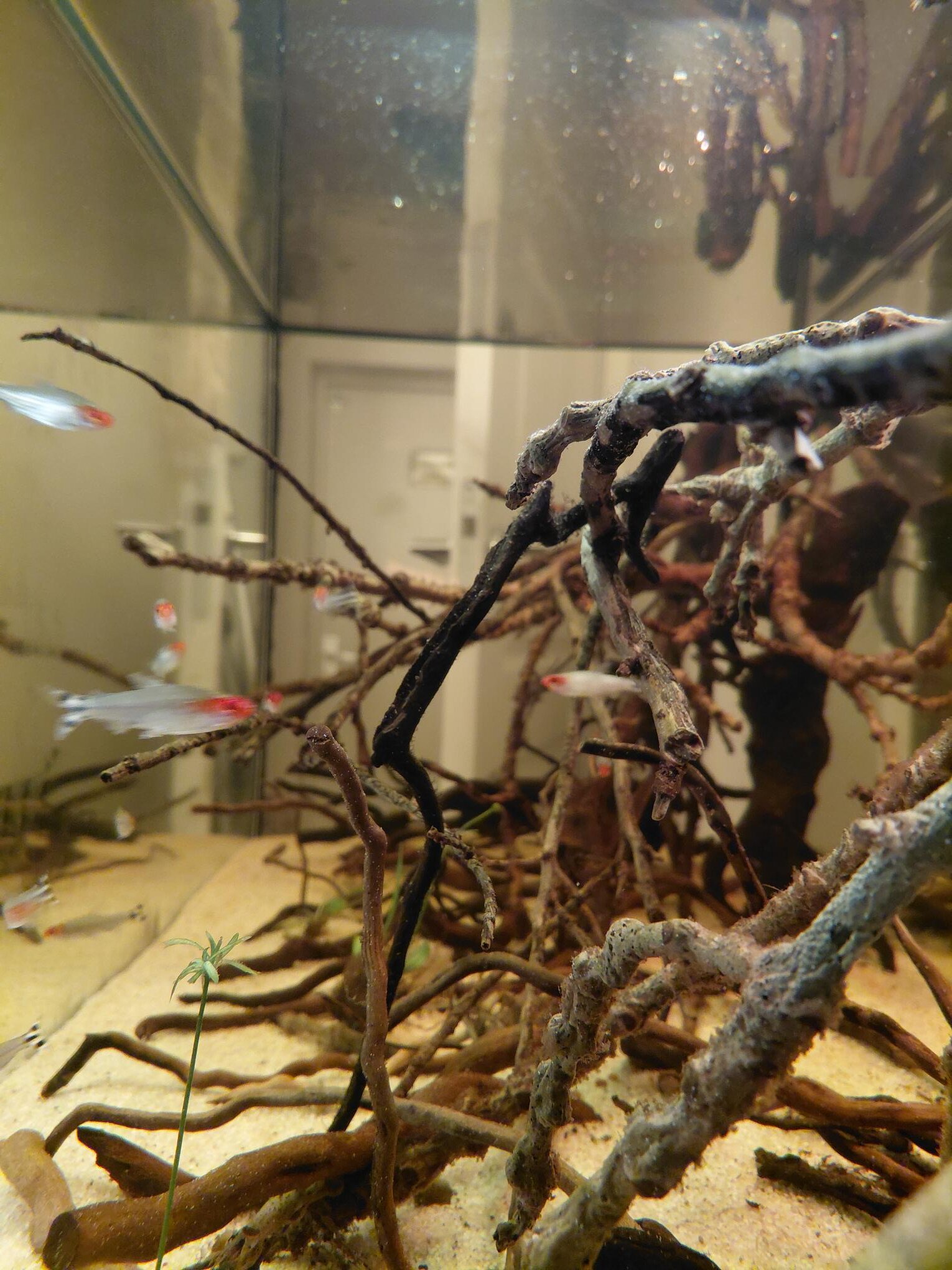 In het kort was ik al een tijd niet geheel tevreden meer met de bak en ja dan wil je wat anders. Even leek het erop dat ik een grotere bak ging nemen namelijk een 240 liter. Toen dacht ik ja maar heb deze bak pas 5 jaar en vond ik het een leuke uitdaging hier weer iets moois van te maken. Ik was al een tijdje geïnspireerd in biotopen en dan vooral de 'black water' varianten uit het Amazone gebied. Daar waar je ware kunstwerken met takken en hout kan maken zoals de natuur het bedoeld heeft. Dus na lang wikken en wegen, inlezen en het belangrijkste, het vrijkomen van tijd ging ik zo'n twee maanden geleden overstag. Ideaal was dat mijn oude bewoners Petitella bleheri (voorheen Hemigrammus bleheri) zich uitstekend lenen voor dit project. Vandaar dat ik de naam van het project zo gelaten heb en tevens van toepassing is op de roodbruine gloed van het water. 😊Goed hier laat ik het bij voor nu.
