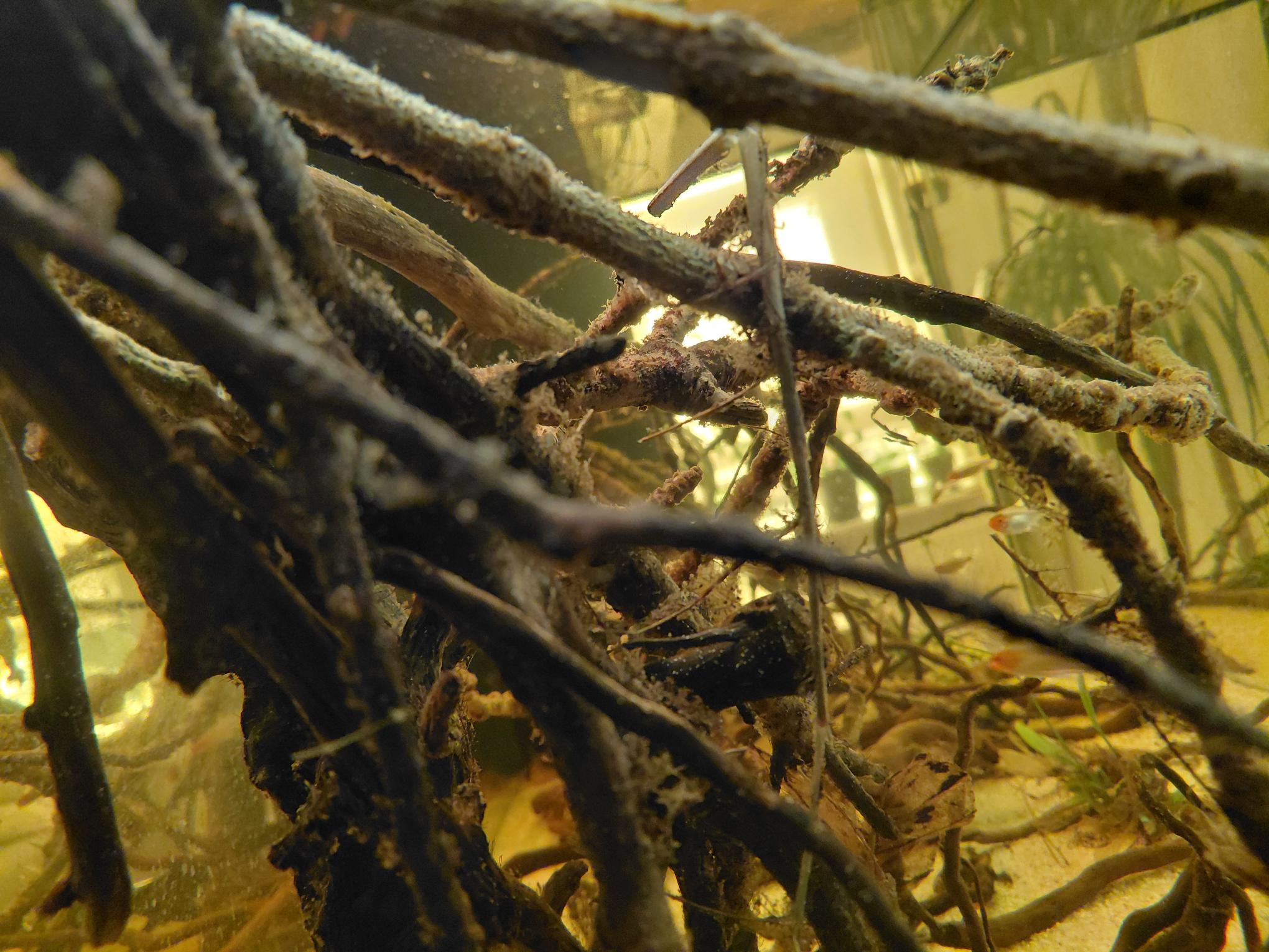 Bij een black water bak kunnen natuurlijke materialen niet ontbreken, in dit geval zijn deze grotendeels echt natuurlijk. Naast wat stukjes spiderwood ben ik ook wezen struinen in de duinen. Men laat hier tegenwoordig het dode hout liggen en gezien ik hier geregeld kom omdat het zowat mijn achtertuin is bracht dat mij op een idee. Takken uit de natuur. Na het hout schoongeborsteld te hebben en vol heb laten zuigen met water, kon het inrichten beginnen. Van oudsher legde ik hout altijd op de bodem, maar besefte dat er een veel natuurlijker effect optrad wanneer ik de takken van hogerop naar de bodem liet lopen. Ik ben erg content met het resultaat.