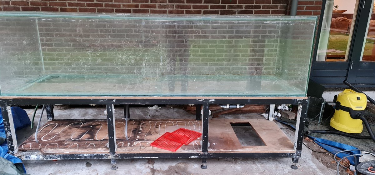 Ik zou een aquarium bouwer laten komen en deze bak op locatie laten kitten. Je betaald dan uurlonn en materiaal kosten maar je hebt dan wel veel meer plezier van je aquarium.