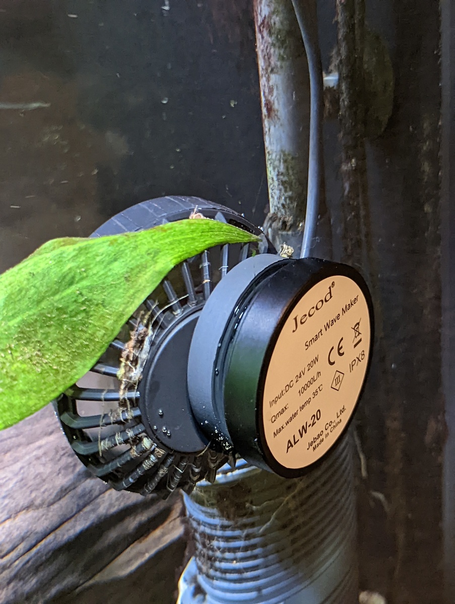 En de MLW-10 volgt nu de flow van de reguliere uitstroom en ondersteunt de stroming enigszins. Deze draait ook op 30% wat neer komt op 1200 liter per uur. En deze draait in de nacht ook volgens een sine wave op 100%.