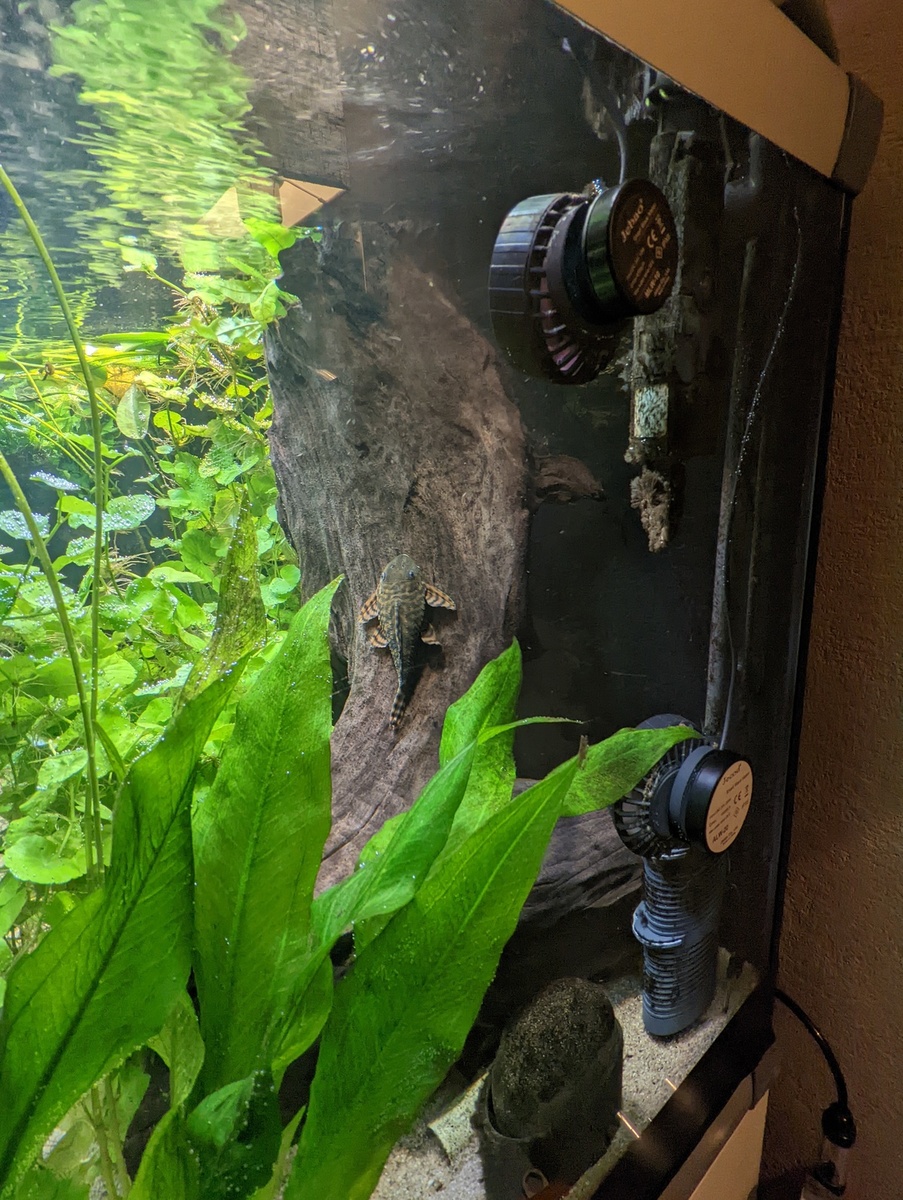 De braziliaanse klimop was echter niet bestand tegen de zuigende kracht van deze pompjes, dus die heb ik uit de hoek moeten halen. Vanwege wat algen heb ik de Bleheri's flink gesnoeid, maar nu staat er 1 in de hoek, die weer mooi moet uitgroeien. Zelfs deze wordt nog richting de pomp gezogen, maar hoop dat dit straks wel mee valt.