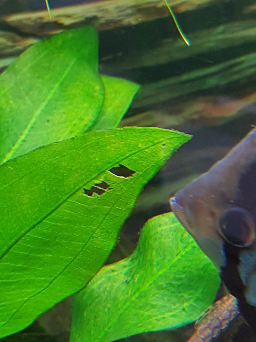 Hier aan de Echinodorus, mooie gaatjes erin, ik heb al eens geprobeerd om ze voeding met een hoger groente gehalte erin te geven maar dat kijken ze na en wachten tot de slakken dat opgegeten hebben.