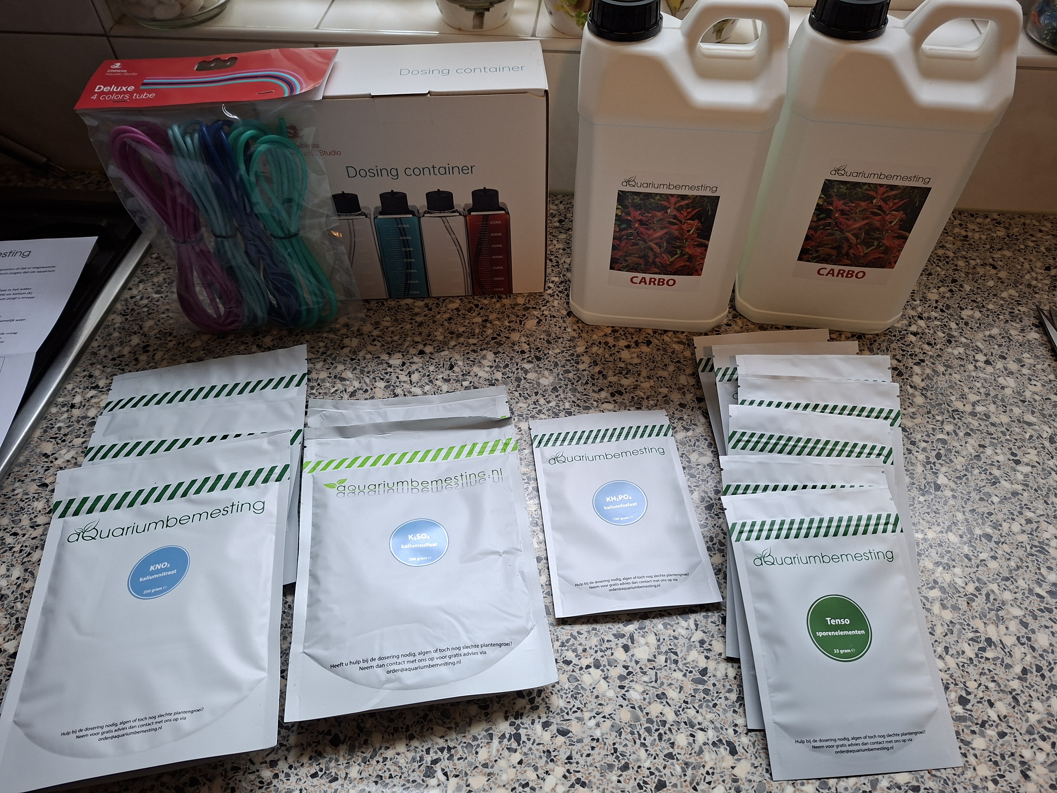 Inderdaad straks ook weer, dagelijks 40ml Micro's of (afgewisseld) Macro's (om 12 uur) en 10ml Carbo (om 22 uur)Dmv doseerpompen toch Jeffrey?