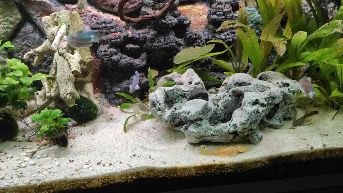 Ruimte, schuilplaatsjes onder plantjes, holle kokosnoot met een Anubia er op en wat zwemruimte links en rechts