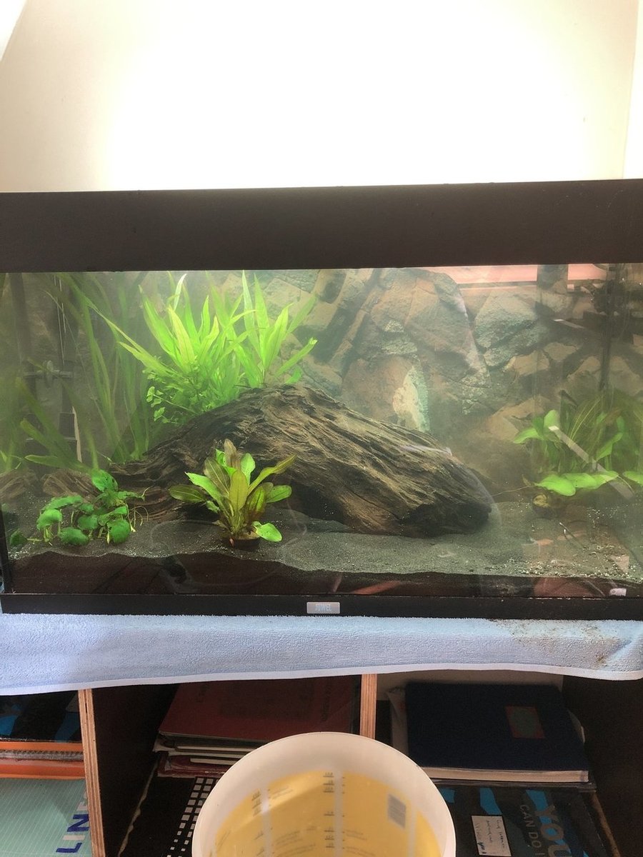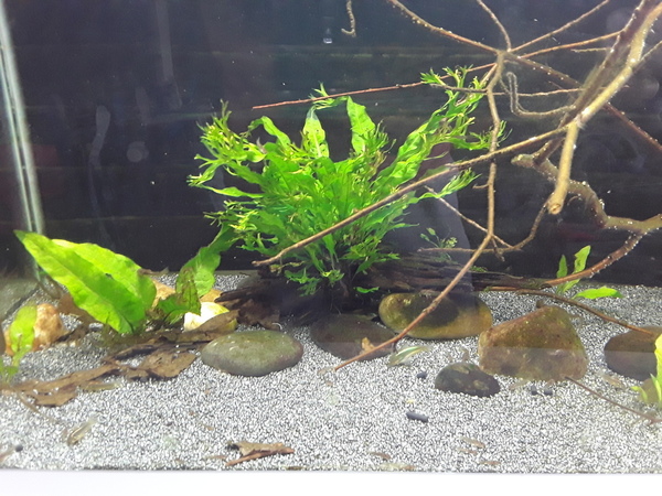 De bodem is nu tussen de 2-4 cm dik. Dit lijkt op de foto dikker omdat de onderkant van het aquarium ook zwart is, nadat de foto genomen was viel mij het ook dat de bodem wat dik was. Ik heb geprobeerd het iets vlakker te maken. Zal morgen kijken of het me lukt de anubias op het hout de doen. Moet dat met een draadje ofzo?