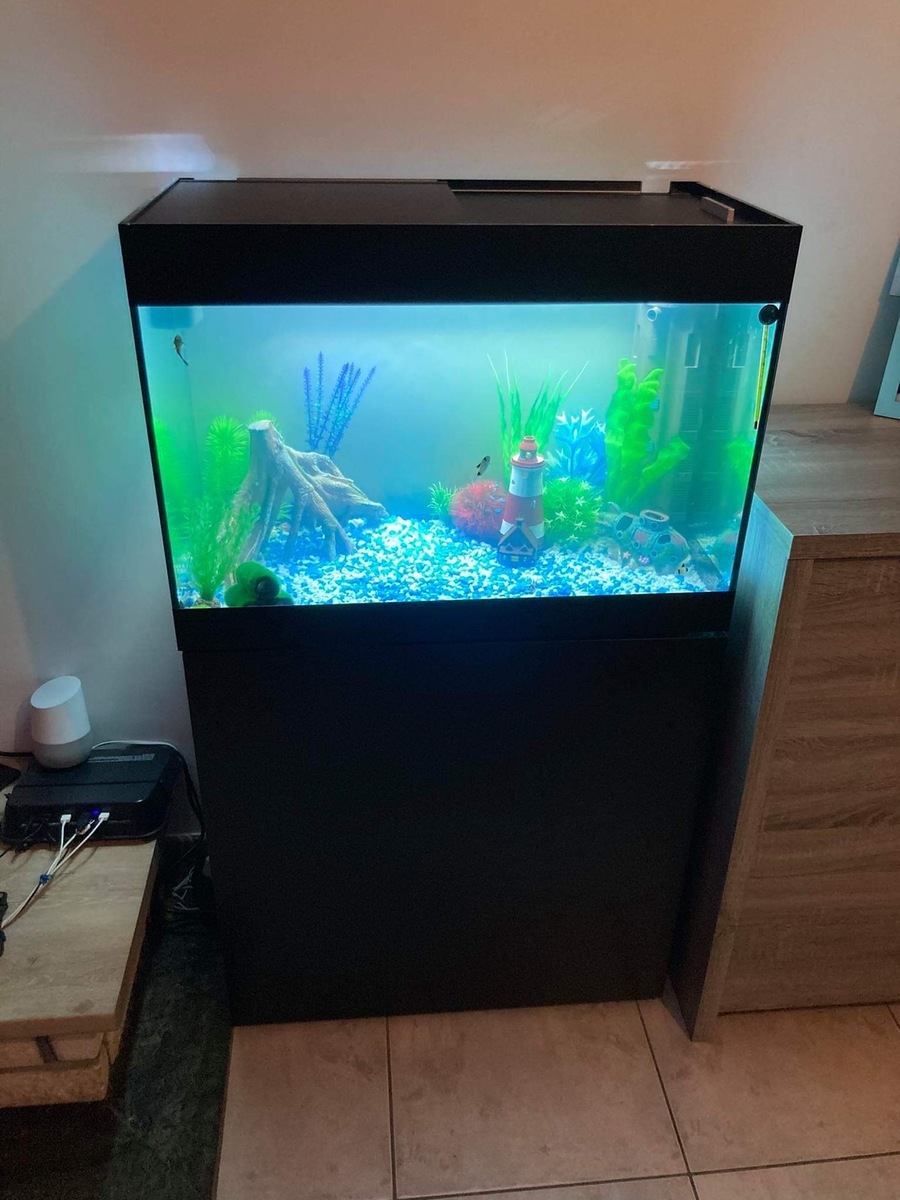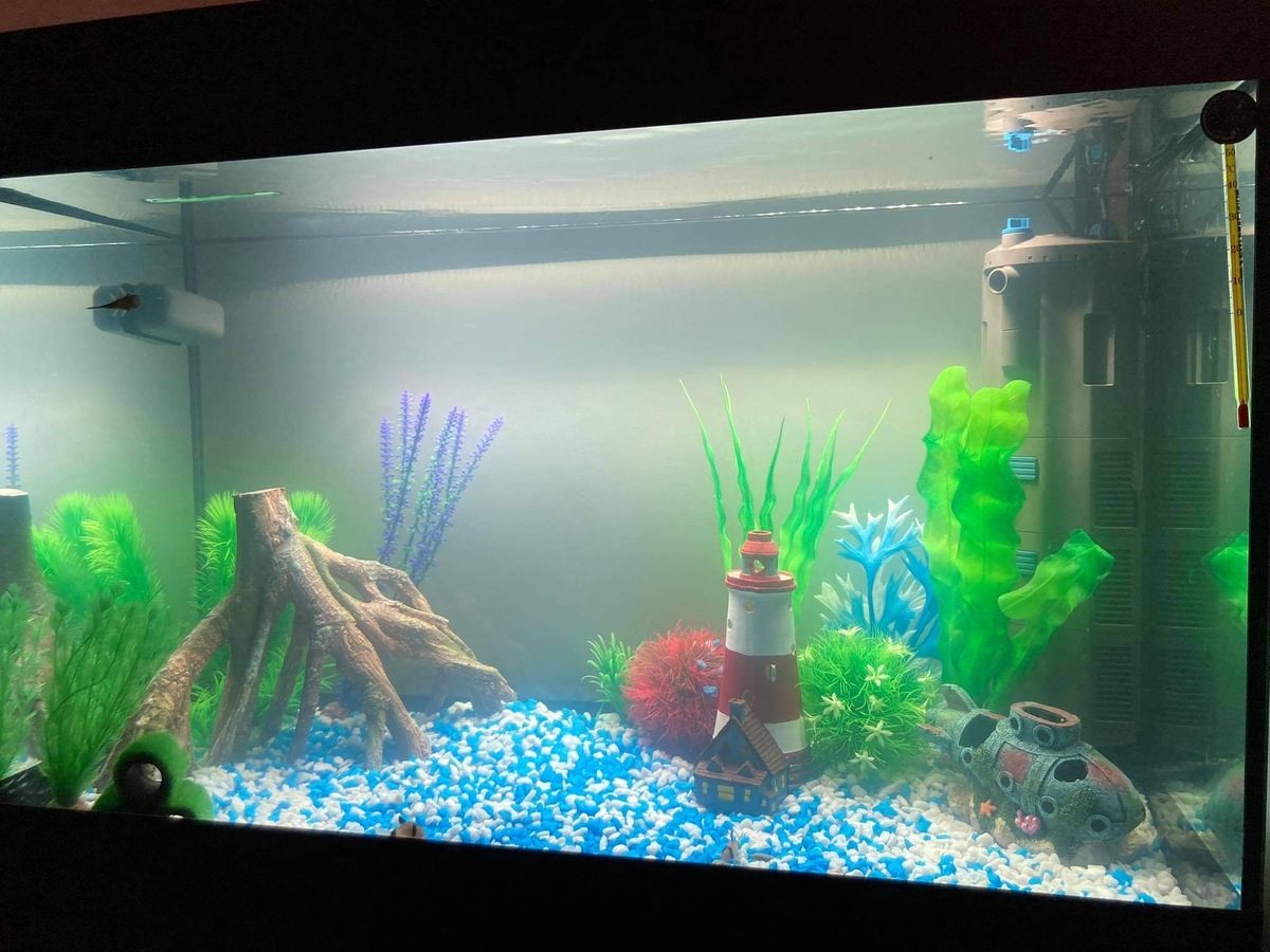 Ik vind je vuurtoren en de duikboot wel hele leuke decoratie, maar kunstplantjes zijn eigenlijk alleen een plek waar biofilm en algen zich kunnen afzetten. Ik zou zelf de kunstplantjes vervangen door echte plantjes, die leveren ook zuurstof.