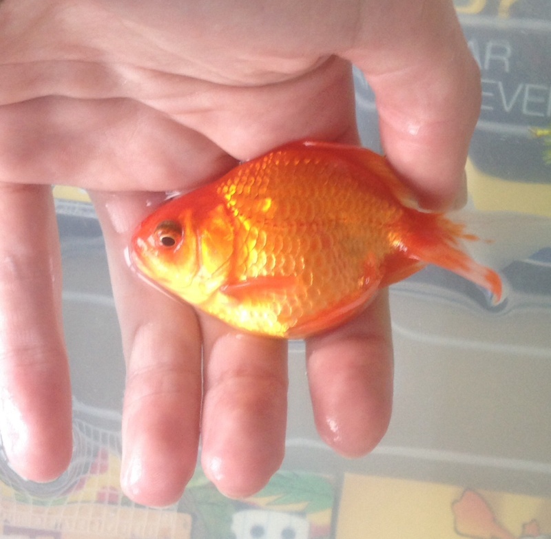 Ik heb wat foto's van de vissen in mijn hand gemaakt. Diego(oranje) is ongeveer 10 cm. , Dora(rood/witte) is bijna 9 cm.