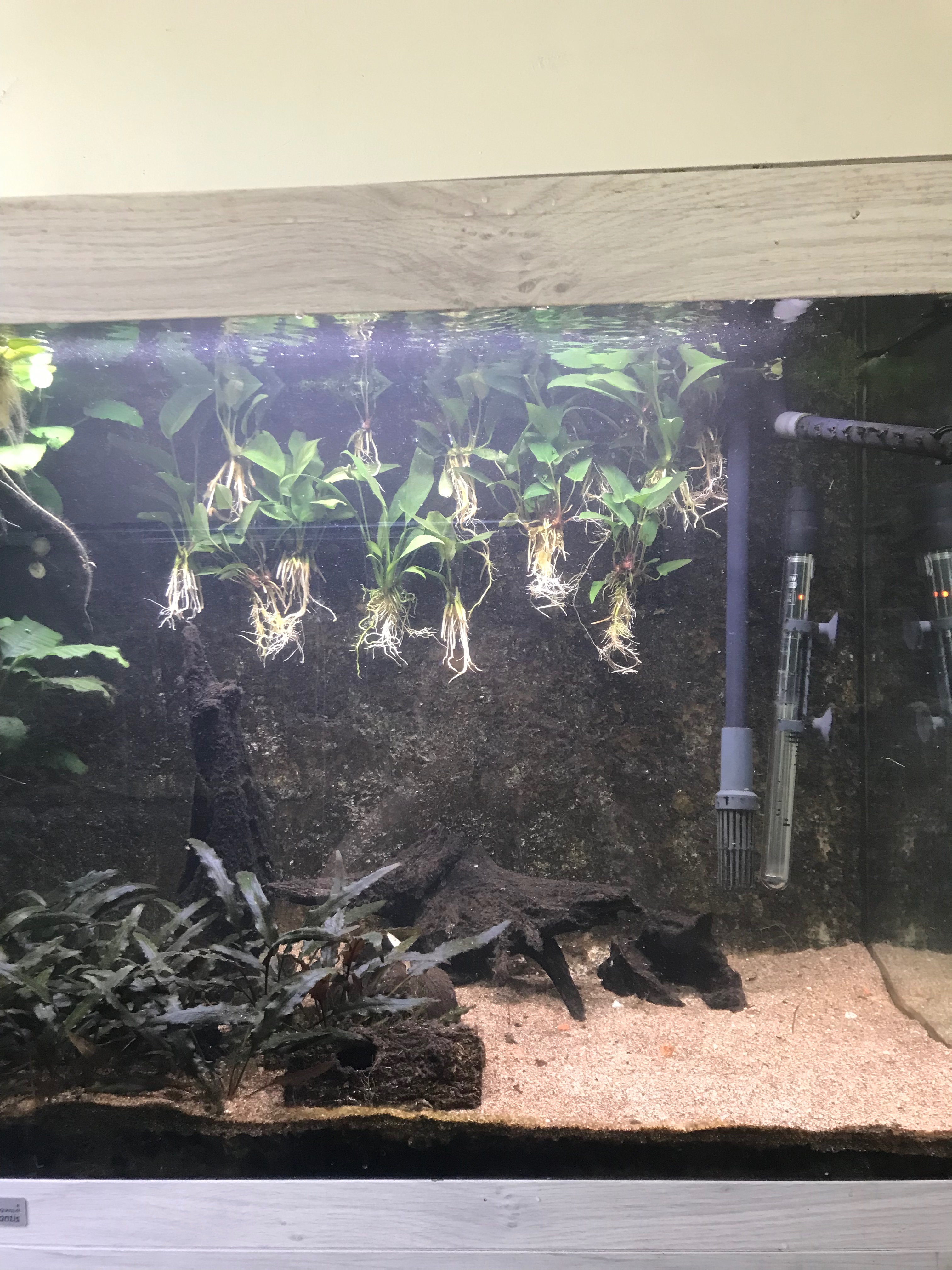 Links de nieuwe inrichting, rechts de oude. De anubia’s moeten nog een stuk groeien, ik hoop dat ze uitlopen en daardoor schaduwplekken gaan vormen. De vissen hebben nu wat meer open zwemruimte