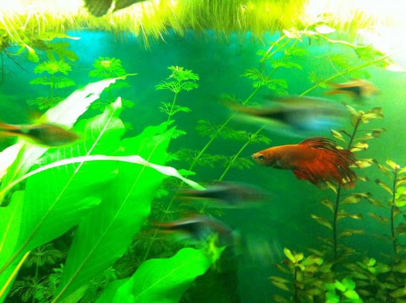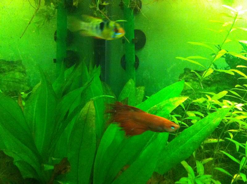 Dan nu even wat foto's, zie je de betta ook mooi naast het antennebaarsje zwemmen : )