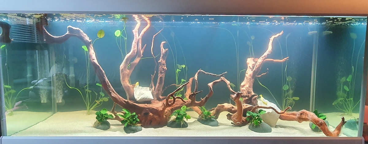 Inrichting dunne laag wit filter zand, enkele stenen met anubias en een flink stuk redmokr hout. Verder nog een paar mooie Hydrocleys Nymohoides stekken. Verder komen er geen planten in.