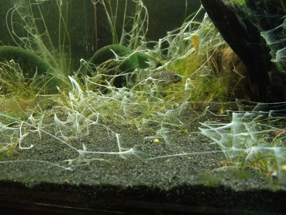 6. Bacteriebron/rotting in filter. Bizarre witte slierten als pomp 2 uur uitgestaan heeft tijdens onderhoud --> dit leek mij uiteindelijk het probleem, echter heb ik dit opgelost. Tussen filterhuis (intern juwelfilter) en de zijwand/glas zat een heel dun laagje wit materiaal. Paar keer schoongemaakt, hielp iets. Uiteindelijk dit afgeplakt tegen licht en het is 100% verdwenen.