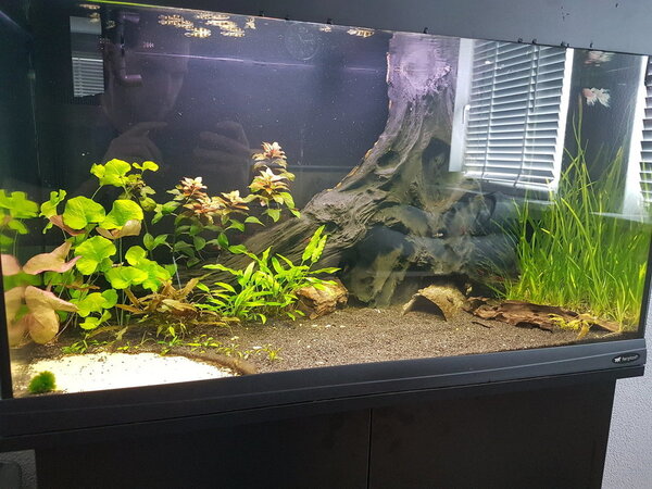 Druk druk en niet heel veel tijd voor het forum. Maar toch maar even tijd maken voor een update. Alles doet het nog steeds zoals 2 maand geleden, vooral de planten zijn lekker gegroeid. Zojuist even een totaalfoto gemaakt, dus wel met wat weerspiegeling. Vanmiddag een waterwissel en schoonmaak vh glas gedaan, dus de bak bijna helder en goed genoeg voor foto's 😀 De opvallende kijker ziet dat er een extra crypto is toegevoegd linksvoor. Vond het gat wat leeg en deze stond mooi vol in de winkel. Vergeten verder foto's van te maken, alleen deze. Onder de totaalfoto een oudere foto van hoe het er uit zag. Ook de groene plant links wat gestekt en meer verspreid.