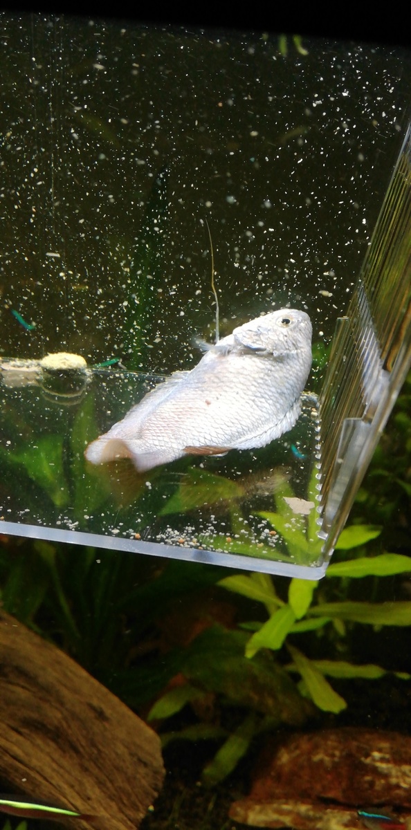 Hallo allen, ik heb erg hard hulp nodig met mijn dwerggoerami. De vis heb ik ongeveer een half jaar in bezit en in het aquarium is er weinig veranderd. Maar sinds gister ochtend lag ze opeens op haar zij op de bodem. Toen ik haar aantikte begin ze barrel rolls te maken en kon ze niet recht zwemmen. Heb haar nu apart in het aquarium gezet middels een bakje waar babies in gehouden worden maar ze blijft op haar zij liggen. Iemand een idee wat er aan de hand is en wat ik kan doen???
