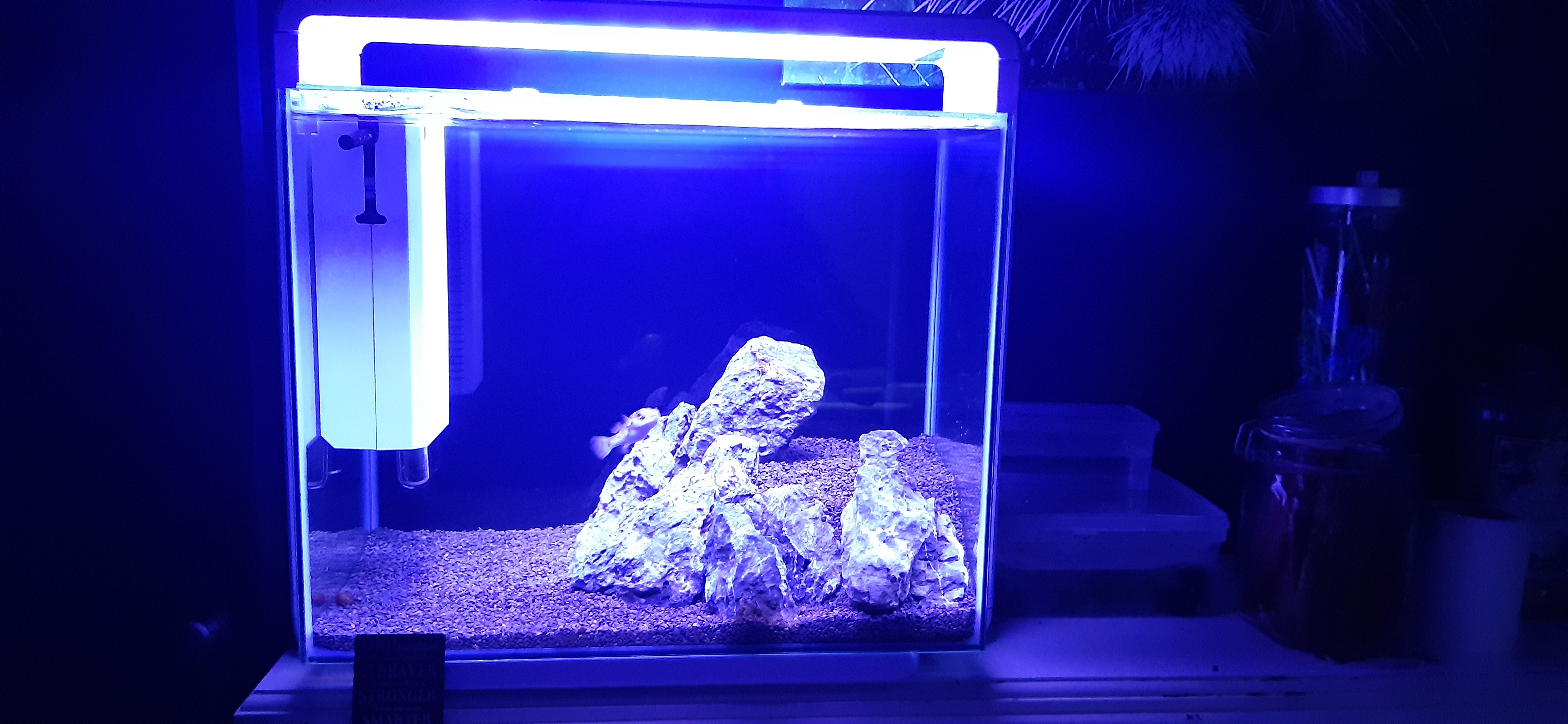De lamp boven het aquarium ziet eruit alsof deze fel brand. Je hebt geen planten, dus daarvoor hoeft het niet. vissen vinden fel licht vaak niet fijn. Deze vis kan dat niet aangeven want hij kan nergens schaduw vinden of een rustiger donkerder plekje.