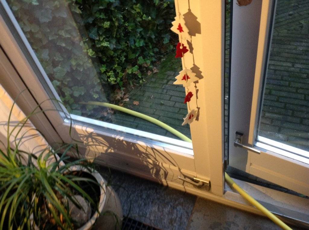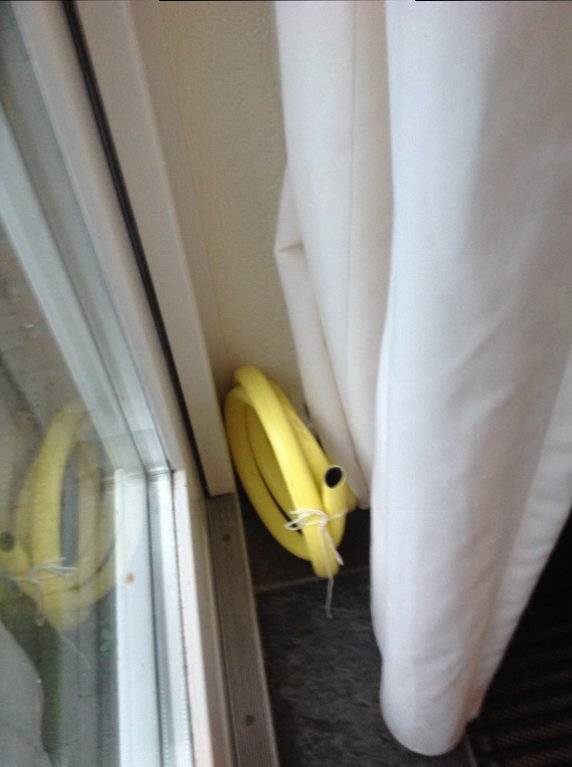 De slang naar buiten, had eerst de dikte van een tuinslang. Maar toenwerd het water niet snel genoeg afgevoerd, dus moest ik een nieuwe wat grotere slang halen. Daar werkte het wel mee, maar dan moest ik de slang wel lager leggen dan het bakje.