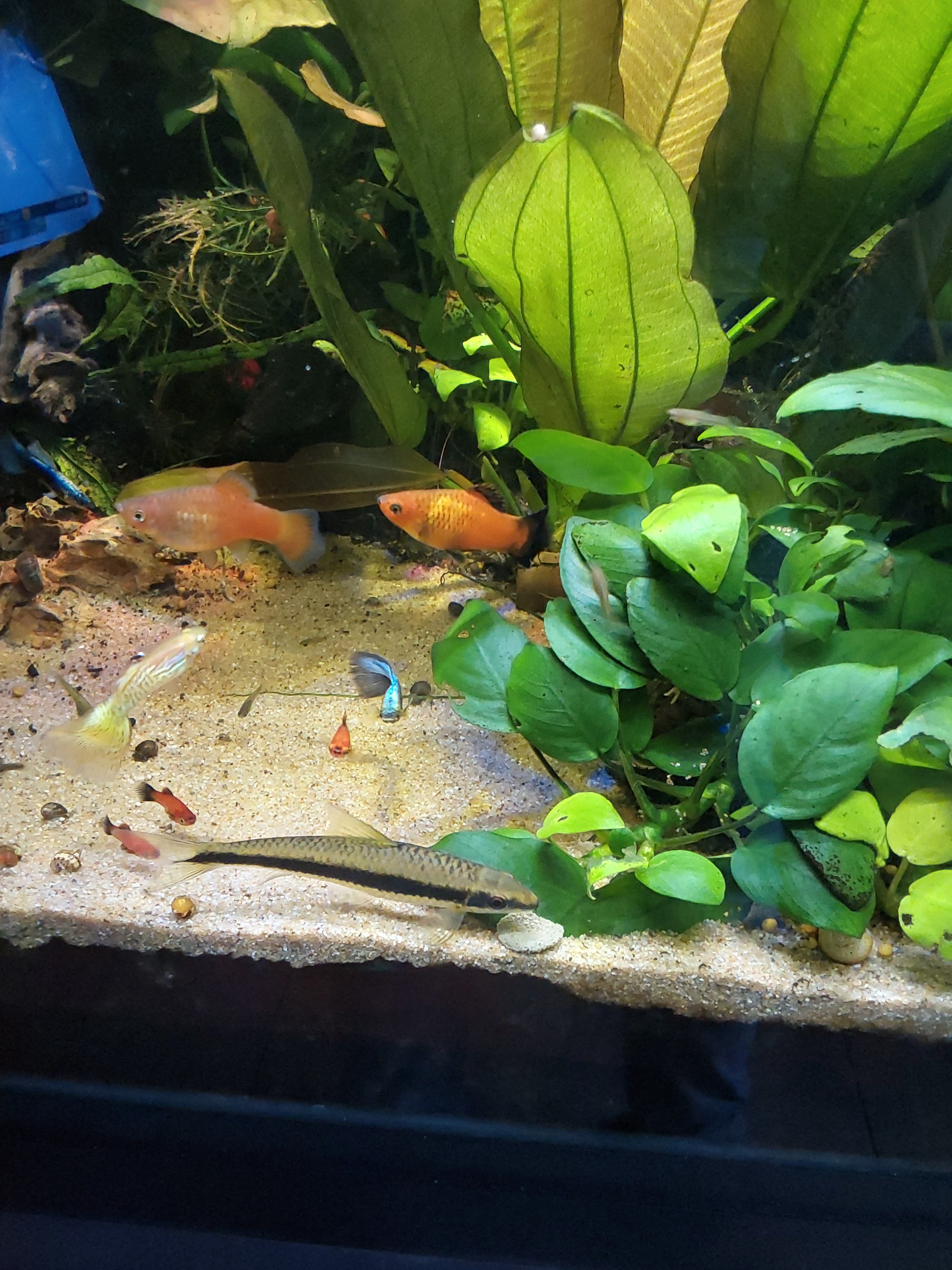 De vissen die er in zitten zijn 2 algeneters met die grote snorharen ik weet de naam zoniet 5 Siamese algeneters paar guppen en platy's en een paar tetra's.