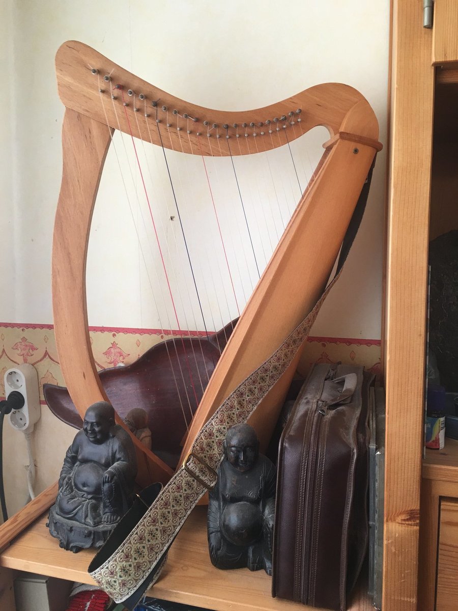 Ik had deze al meer dan 20 jaar geleden overgenomen van iemand, maar door werk en andere muziekactiviteiten eigenlijk nooit tijd gehad om me erin te verdiepen. Bovendien… zo’n troubadourharpje in C zonder haken…Maar nu was ik weer bezig met middeleeuwse muziek, en dat is precies het goede instrument en ben ik blij dat ik ‘m heb…Harp! Een prachtig geluid heeft zo'n instrument, vind ik. Een "grote" maar ook zeker zo'n draagbare versie. Daar ga je vast heel veel plezier aan beleven!