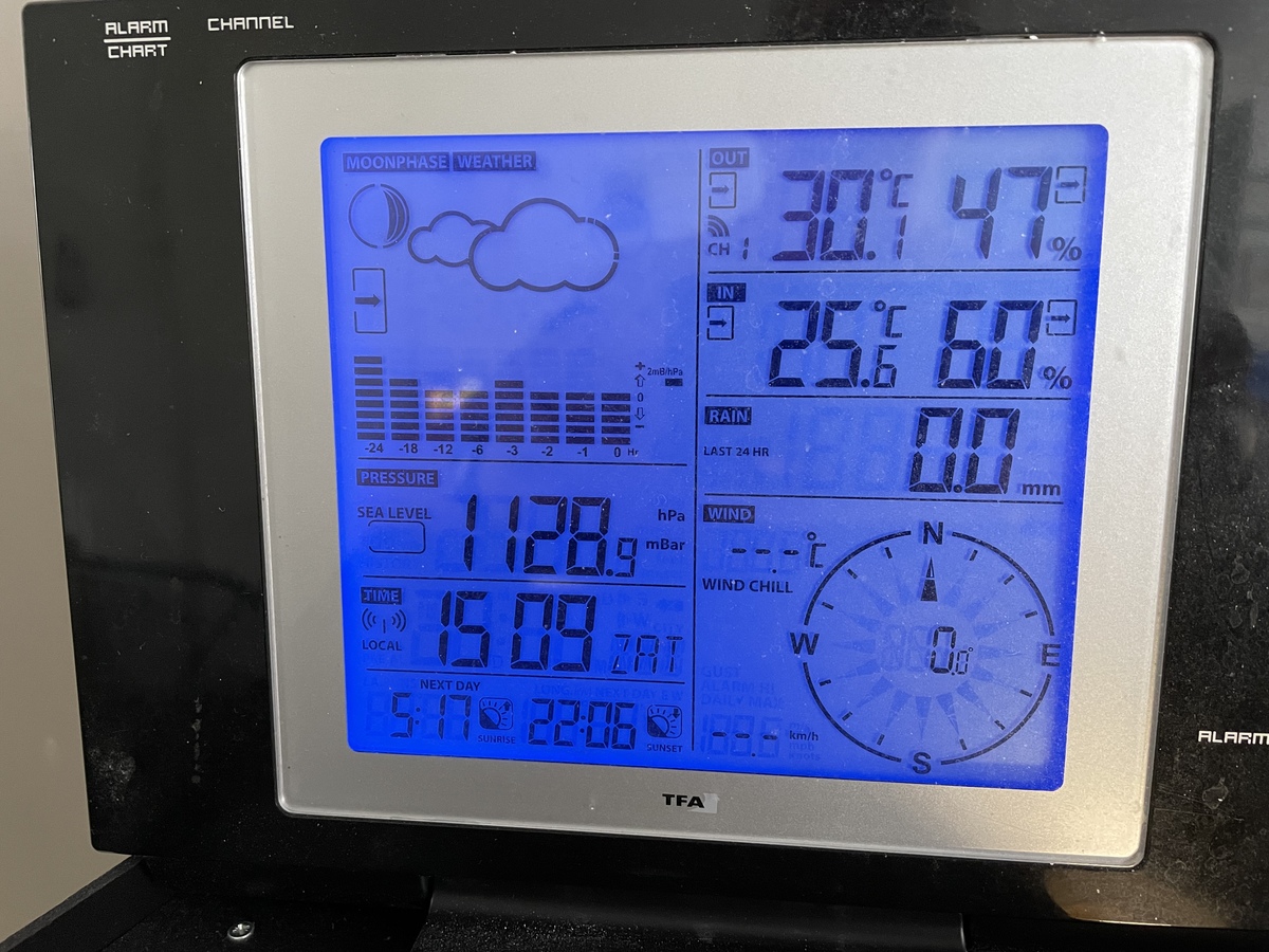 Inmiddels is het hier 18:40 uur en het is drukkend warm. 26,5 graad Celsius vermeld de buiten thermometer maar mijn interne meter schat de temperatuur hoger in. Regen zou pas morgen aan de orde zijn, meen ik.Lekker luieren op de bank en wachten tot het 17.00 uur is want dan is het hier nog maar 19 graden gevolgd door 8 mm regen.