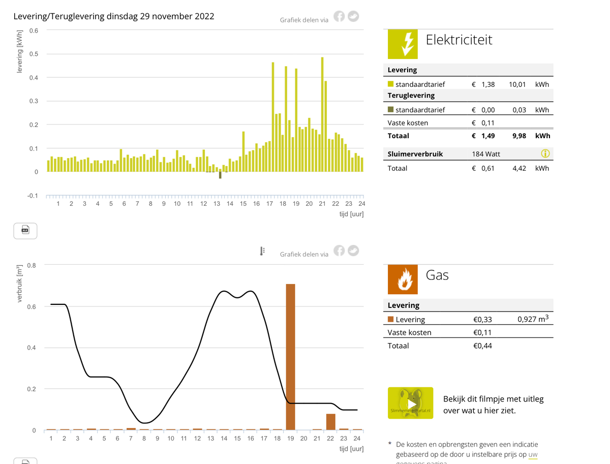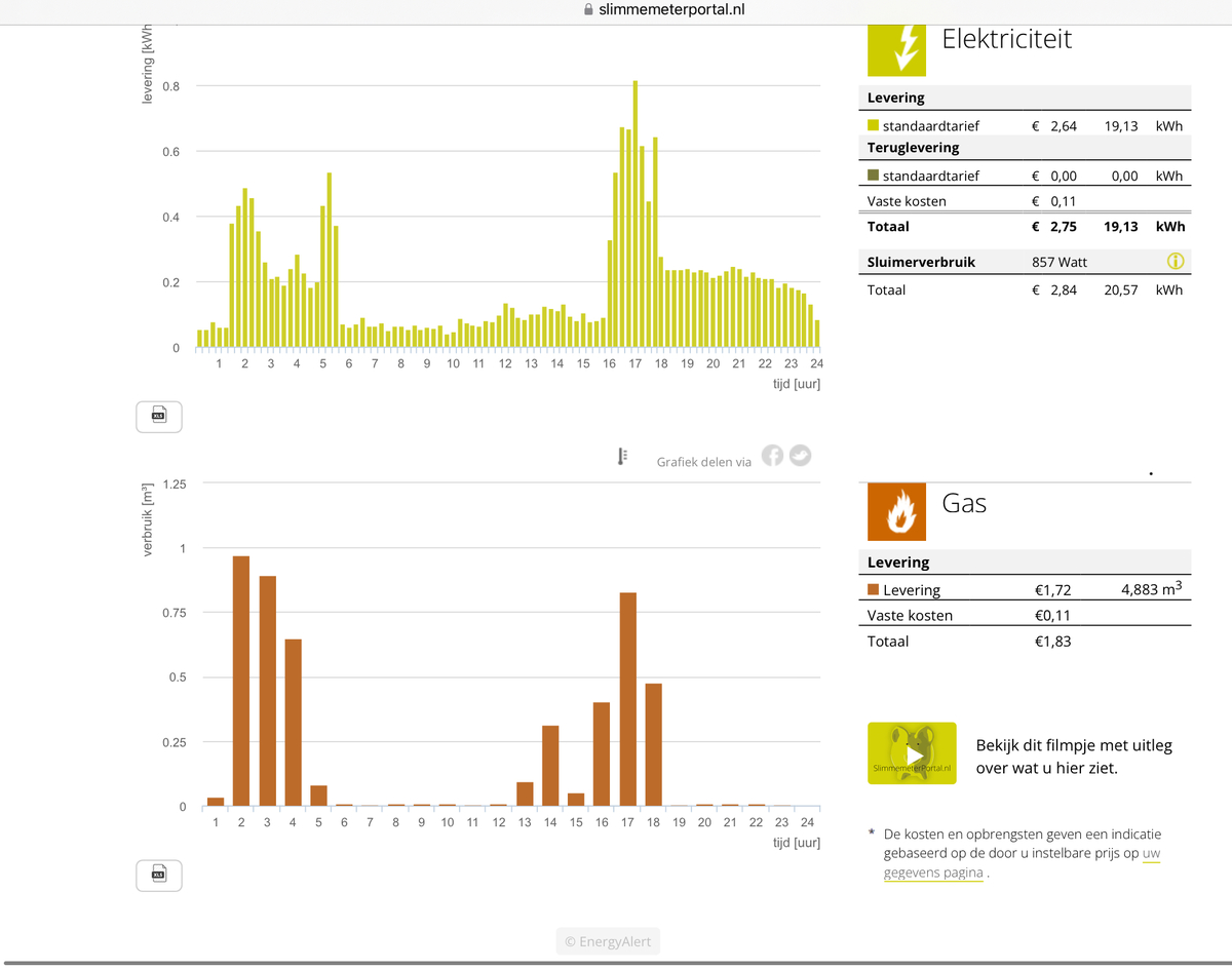 hier zie je het verbruik stroom en gas van gister over 24u.