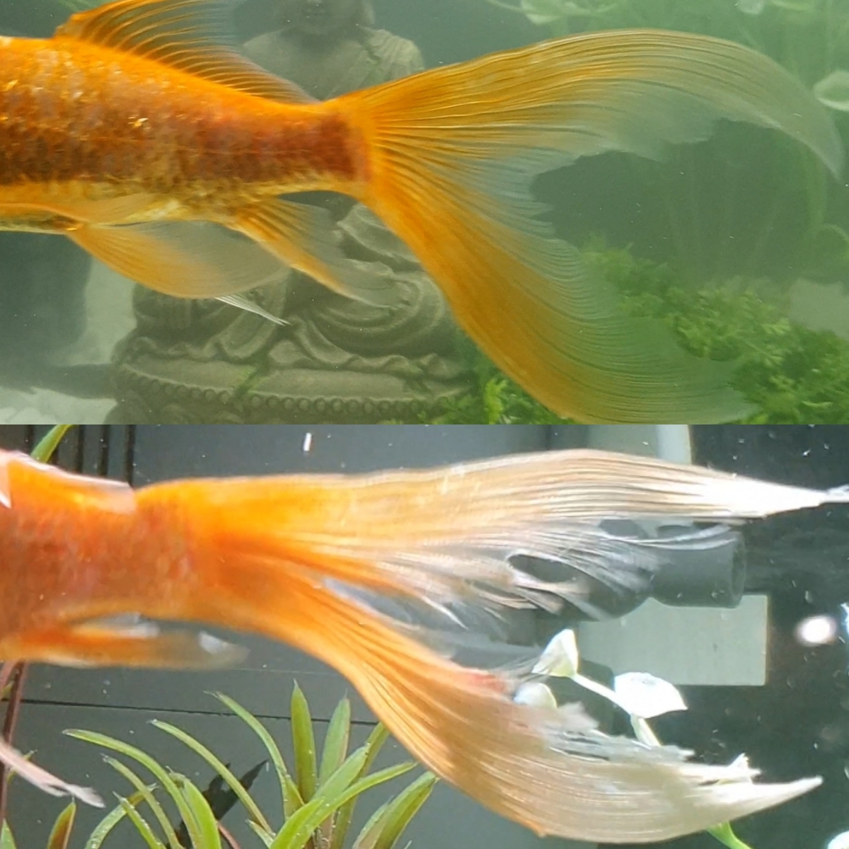 De eerste week ging super. Hij zwom terug rond en was zijn oude zelf. Nu sinds 2 dagen merk ik dat Chester vrij zenuwachtig rond zwemt. Meestal tegen de stroom van de filter en nu merkte ik ook op dat zijn mooie staart nu volledig gekarteld is.