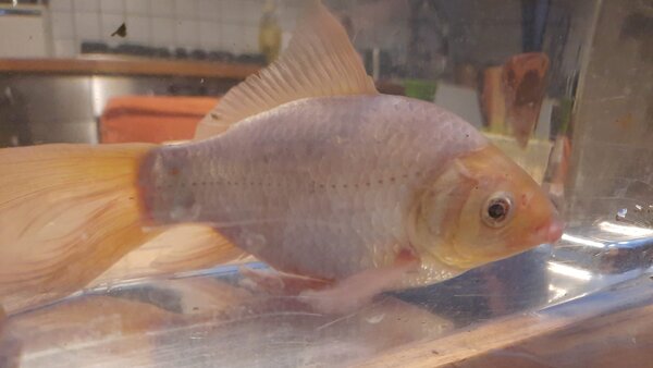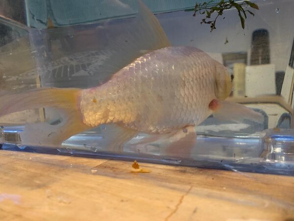 Omdat het steeds slechter gaat met de vissen..heb ik vandaag de oude/grote even in een klein quarantaine bakje gezet om te kijken of ik iets kon zien.