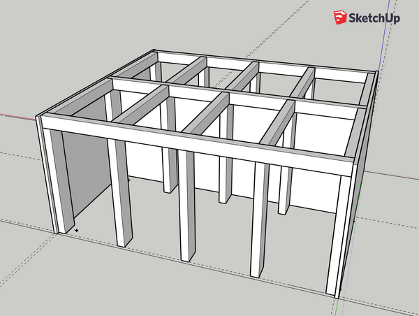 Qua afmetingen denk ik nu aan een bak van 160x140 cm en 65 waterhoogte. De bodemplaat (uit twee delen) wordt 15 mm. De rest wordt 12 mm poly geslepen). Gezien de grootte van de bak moet deze op locatie worden gemaakt. Ik ben in sketchup bezig geweest om de contouren van de bak en het onderstel uit te werken. Hieronder enkele afbeeldingen.