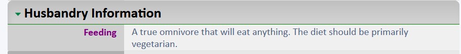 Wat een onzin.. en dat voor een zelfbenoemd "kweker". In het wild zullen ze eten wat ze tegen komen: Plantaardig, dierlijk, levend, dood.Letterlijk staat er: the diet should be primary vegitarian. Letterlijk vertaald: het dieet moet hoofdzakelijk bestaan uit vegatarisch.