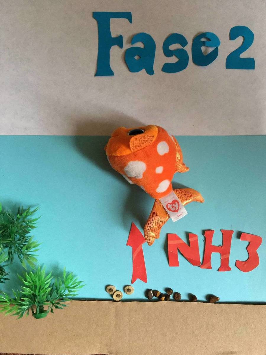Fase 1 vis voeren, poepjes komen eruit, Fase 2 poep op de bodem vormt NH3, vis zit aan de oppervlakte, Fase 3 NH3 etend baccie vormt NO2, vis drijft dood op z'n rug, Fase 4 Dode vis weg, NH3 etend baccie vormt NO2, NO2 etend baccie vormt NO3, plantje eet NO3.:!