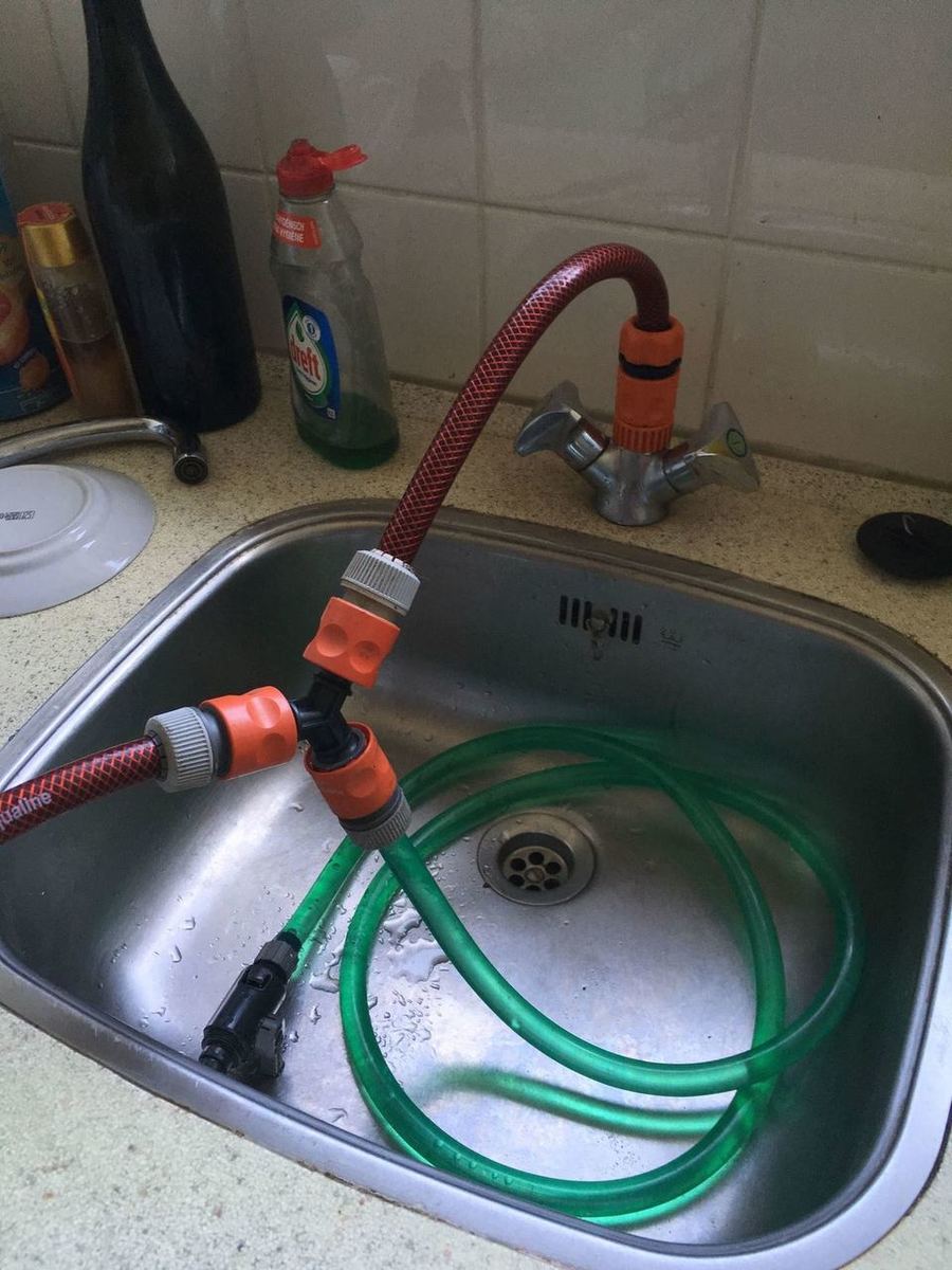 Ik hing gewoon een tuinslang in mijn bak, die ging of naar buiten of naar de badkamer/wc.