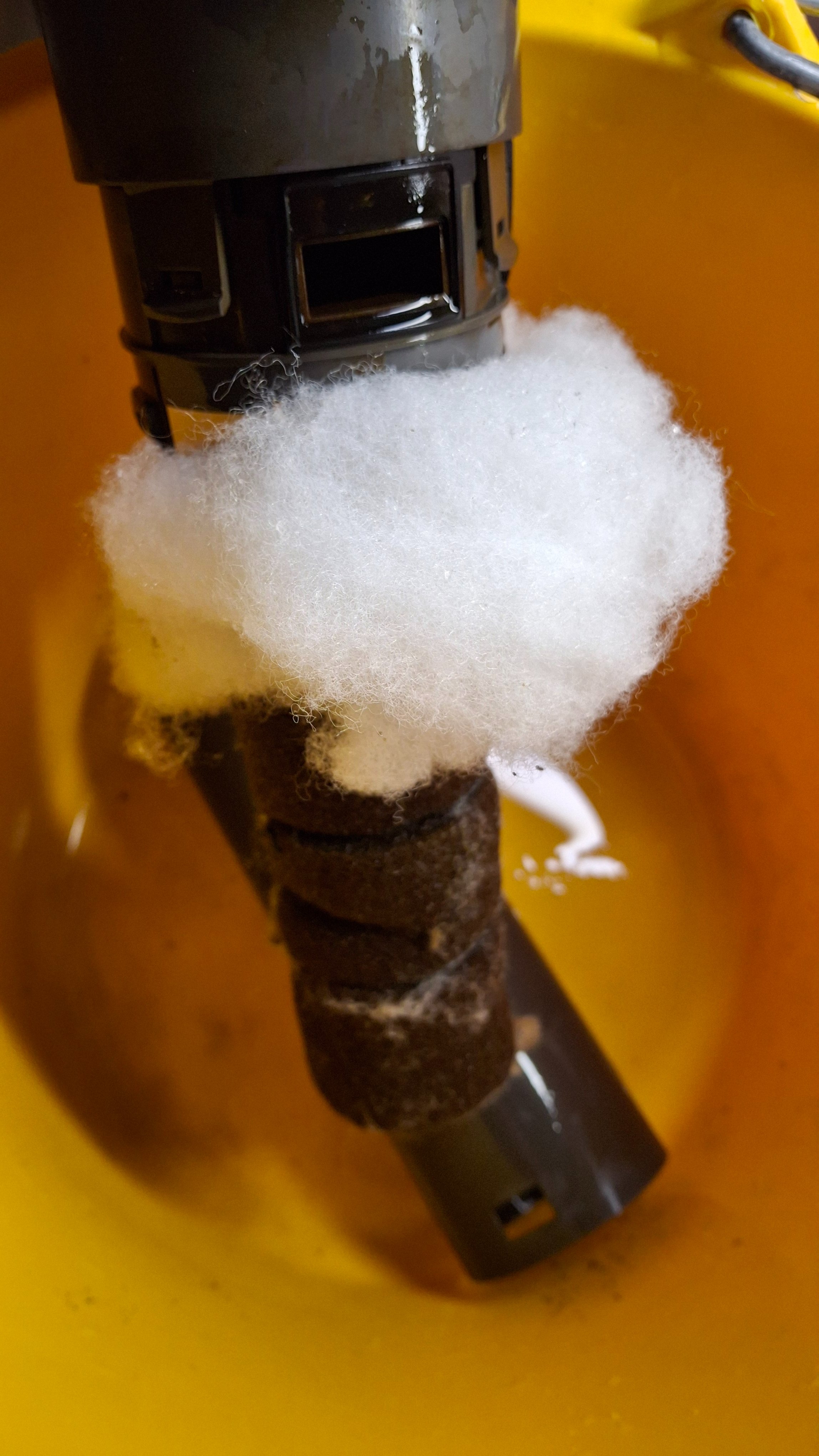 Dan in het filterhuis werken en opletten dat het schuim onderin niet van de buis af valt.