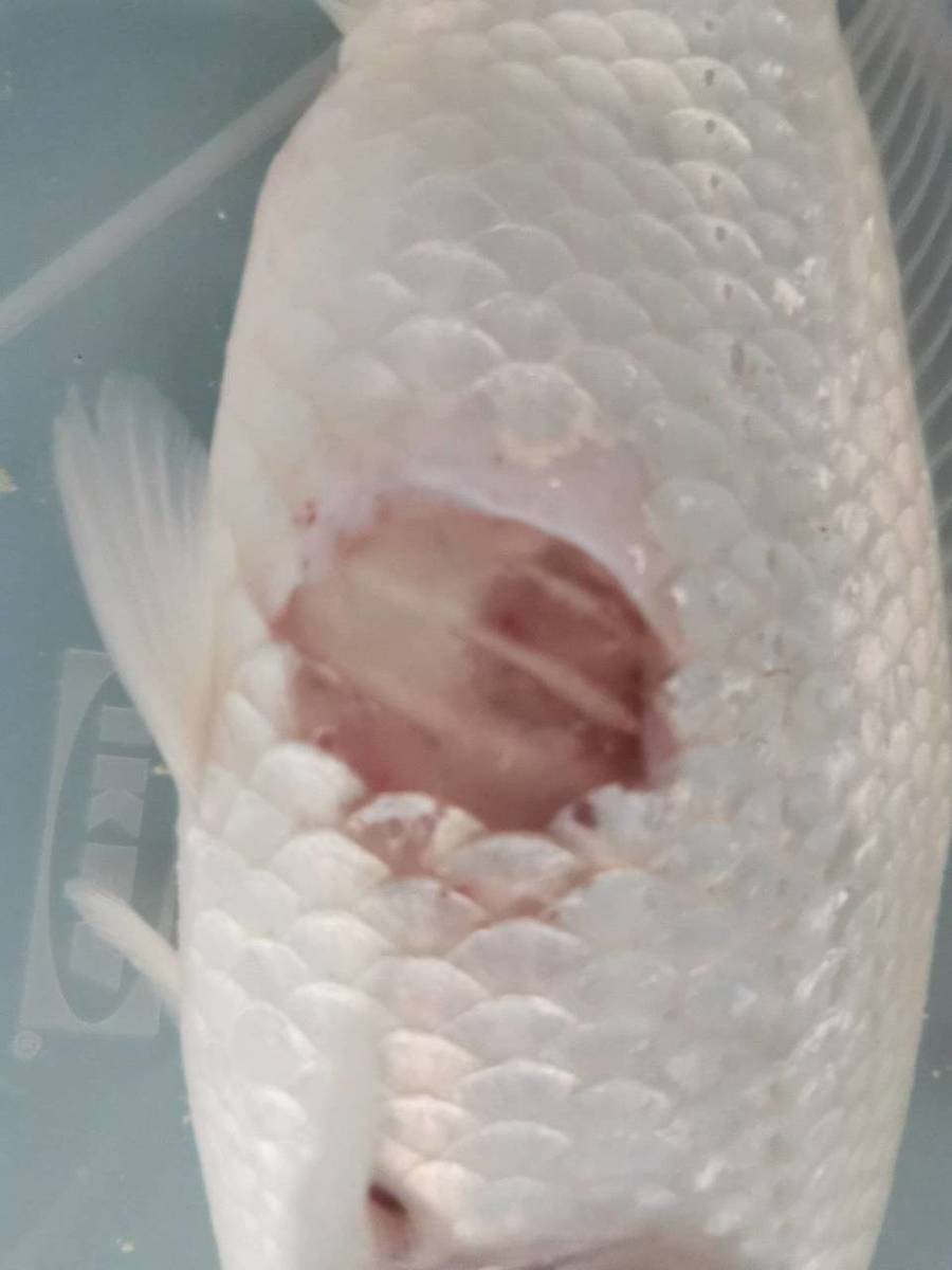 Het zal een gevolg zijn van ammoniak en nitriet piek in de vijver. Ammoniak brand op de vis dus wellicht een soort van brand blaar. Het kan ook begonnen zijn als klein wondje wat dan geinfecteerd raakt. Het kan ook iets intern in de vis zijn.