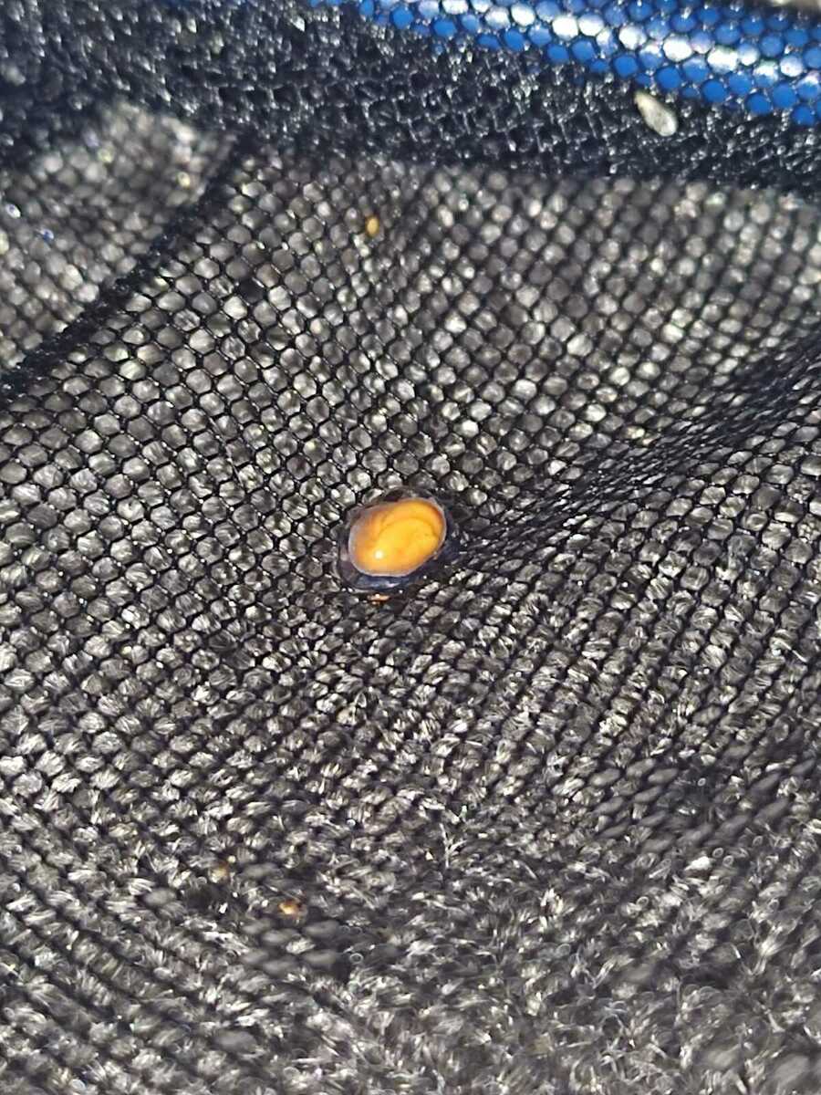 ik zag het op mijn grind liggen dus ik heb het er maar uitgevist. het is een oranje achtig balletje met een doorzichtig laagje erover. het valt niet uit elkaar als ik het vast pak dus ik denk geen schimmel?