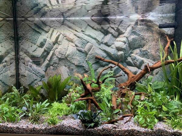 Ik heb vorige week een stuk hout gekocht en paar dagen laten weken in een bak. En had ook plantjes besteld en deze zijn vandaag toegekomen. Nu wil ik zoveel mogelijk naar een natuurlijk biotoop gaan. Zou graag nog een stukje hout en paar rotsen er in willen en dan kan ik alle planten een vaste plaats geven.