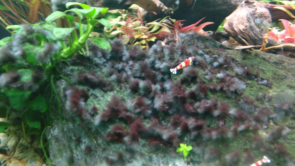 Ik zie beide combinaties van de groene alg op mijn ruit, dat en baardalg dus op de stenen en langzame groeiers onderin de bak.