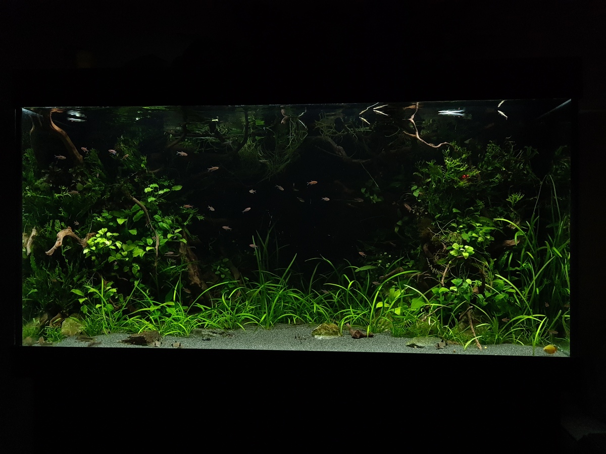 Ik heb wel 2 grote zones beplanting maar een open middenstuk. Als het schooltje diamantzalmen echt actief wordt, zie ik ze weinig… misschien te druk voor hen? Of opnieuw het felle licht van de standaard Juwel verlichting?