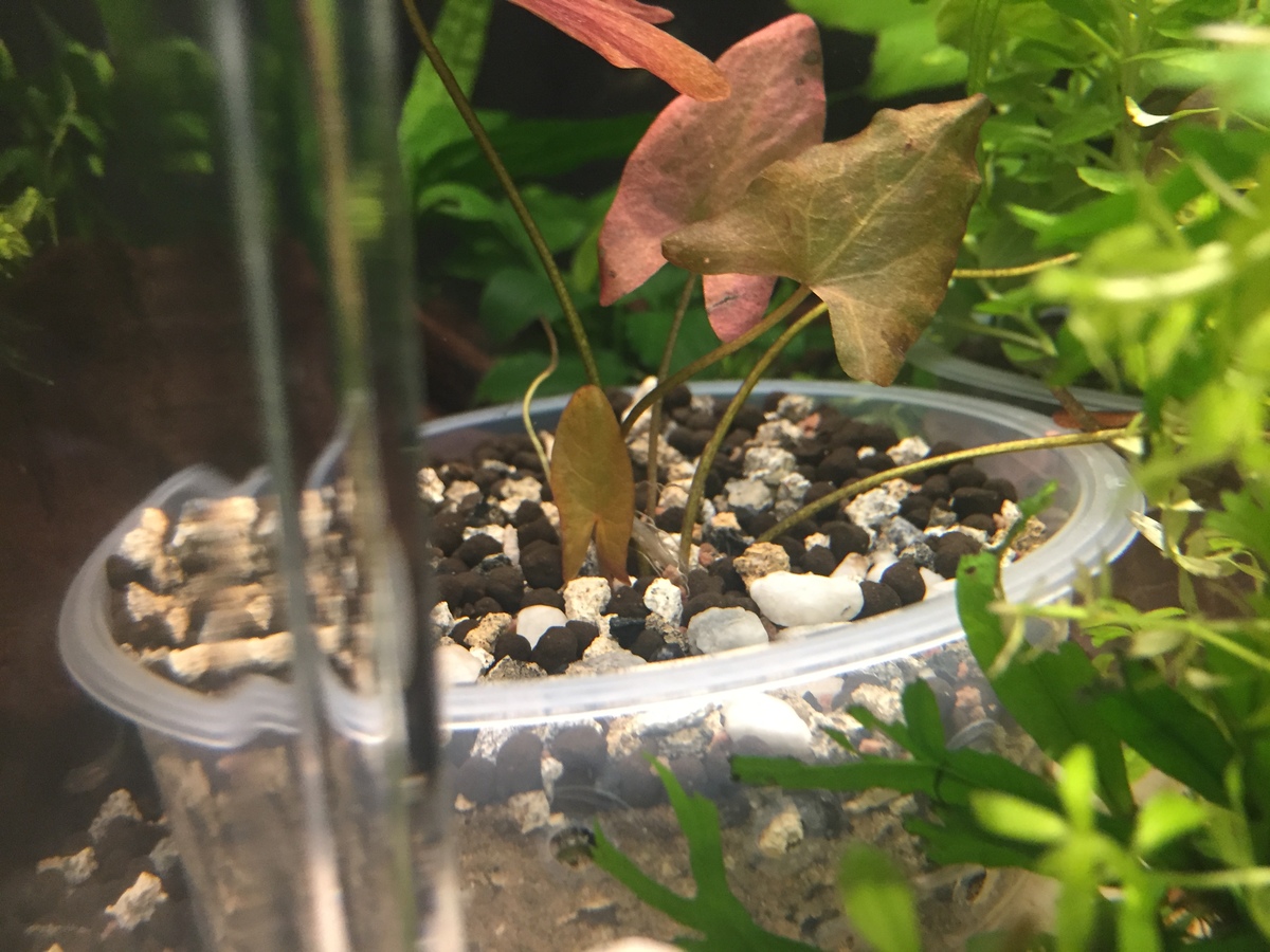Nog niets schoongemaakt of dood blad weggehaald, maar ik had ook maar 1 dood blaadje die ikzelf per ongeluk geknikt heb in het begin. Verder drijft er her en der nog steeds een beetje plantmateriaal rond wat niet vast zit of drijvers die naar beneden zijn gegaan: