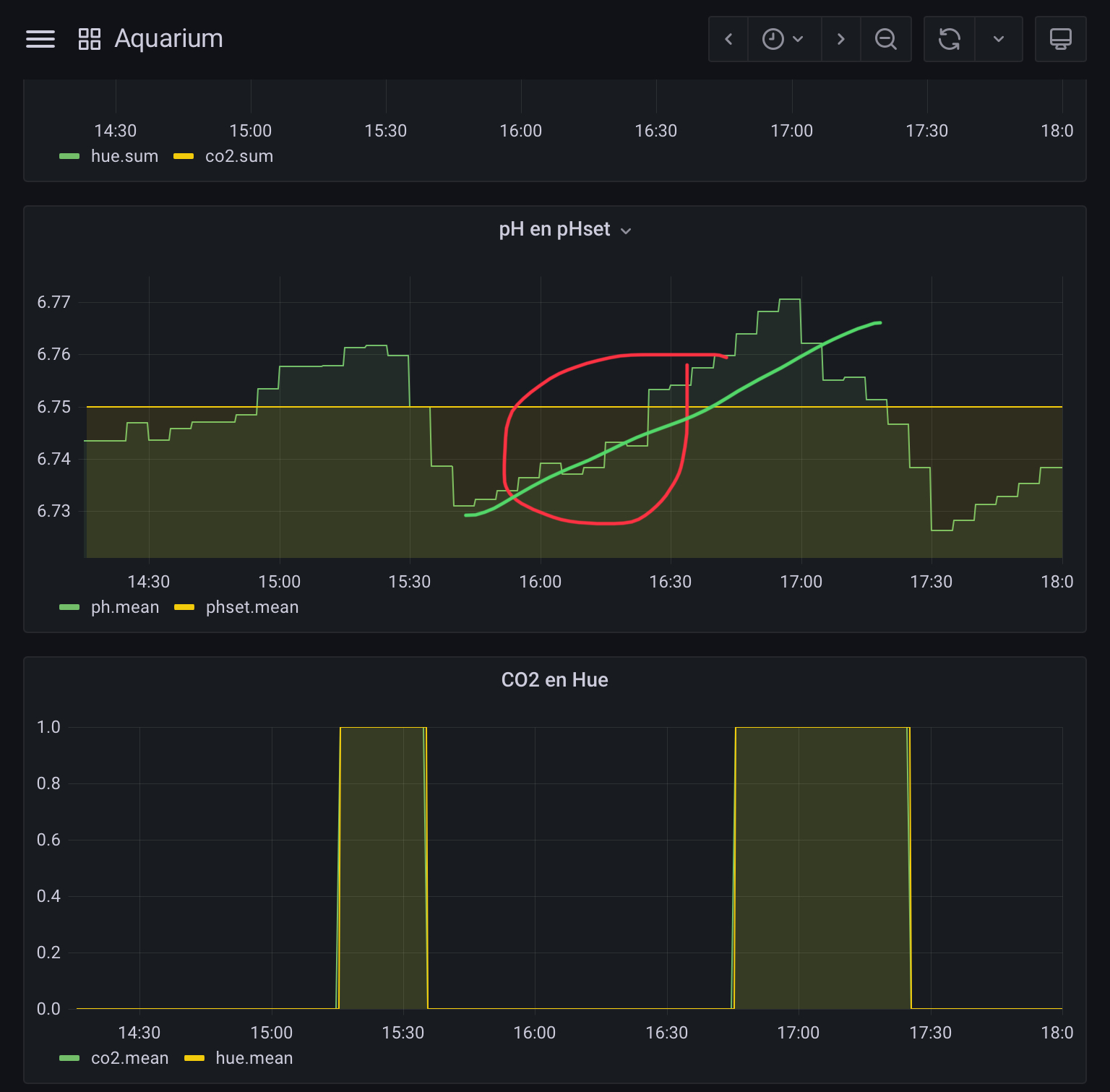 Mijn verlichting staat aan van 12 tot 22 uur, in onderstaande screenshot gaat skimmer 15 minuten aan om 16 uur (ROOD omcirkeld), er is slechts een kleine verspringing (verlies) van CO2 te zien, misschien 0.01 PH verlies, het gaat om niets.