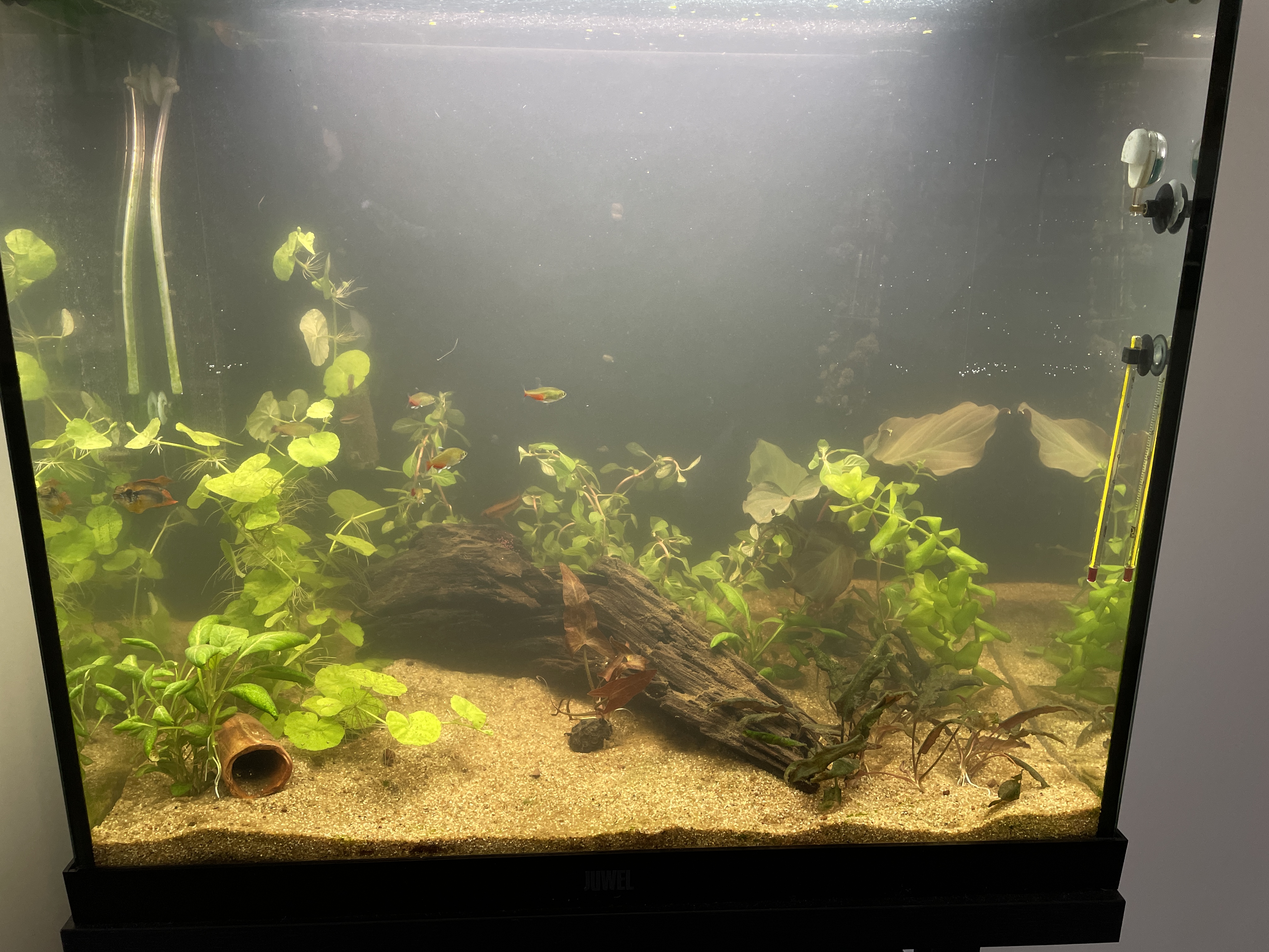 Staat er mooi bij hoor Albert.Niks mis met wat algjes. Zolang ze niet Blauw worden of gaan overheersen. Ze groeien er wel overheen. En anders gaan ze richting GFT bak