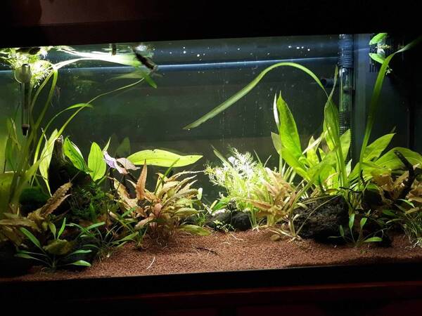 • andere inwoners zijn: twee panda garras( garra flavatra), vijf endler vrouwtjes guppen, een appelslak, en een zweepstaart meerval (whiptail catfish).