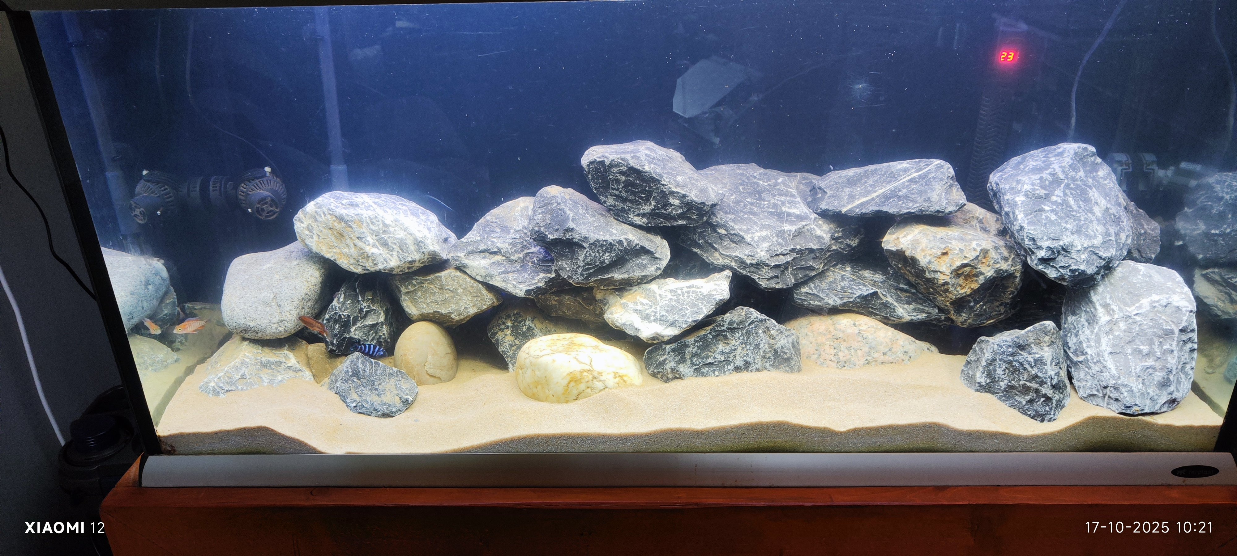 Daarbij moet u rekening houden met de opbouw van stenen en het feit dat de ruimte tussen de stenen groot genoeg is om voor welke Malawi vis dan ook daar tussendoor kan bewegen en daar zich even te verschuilen, dat kan met te kleine stenen en tussenruimte's later een probleem worden wanneer de vissen groter worden.