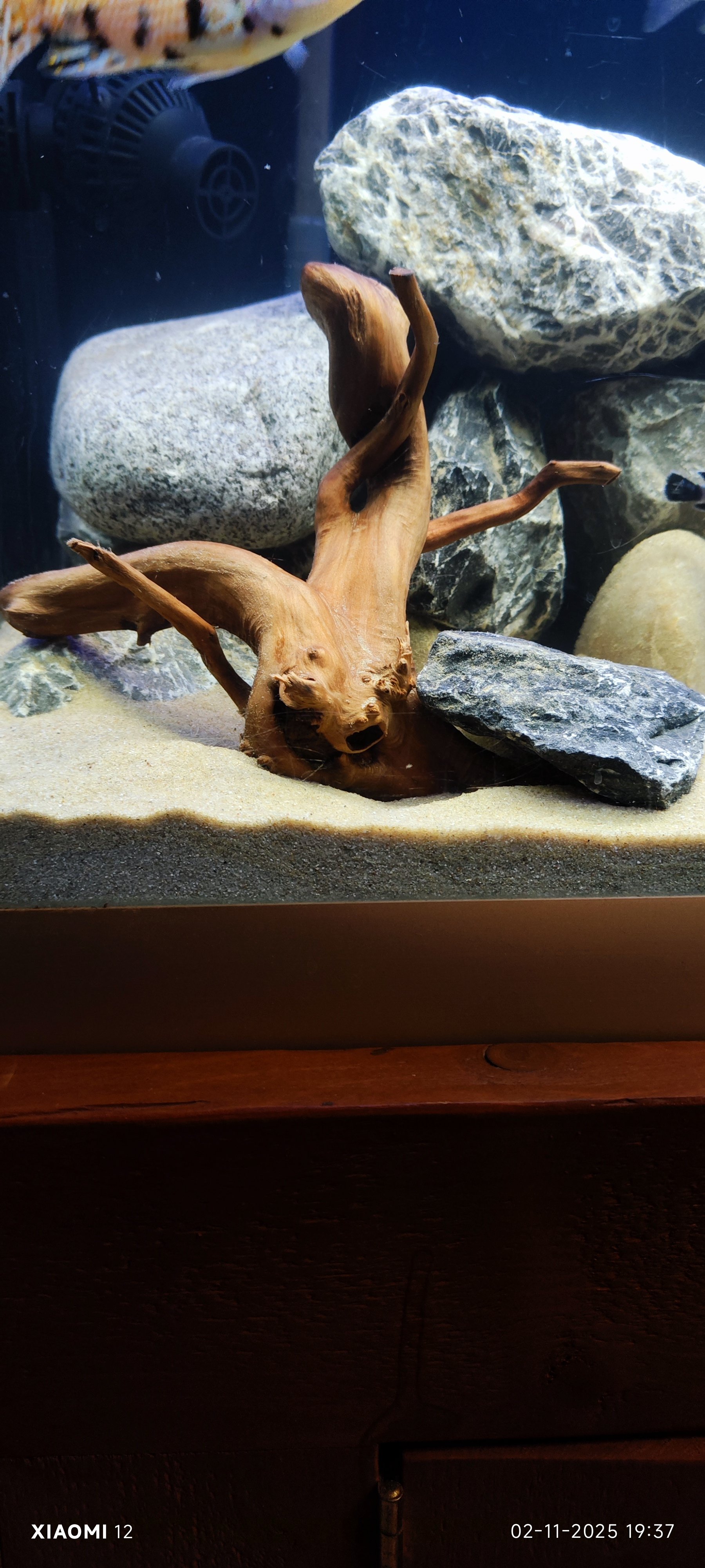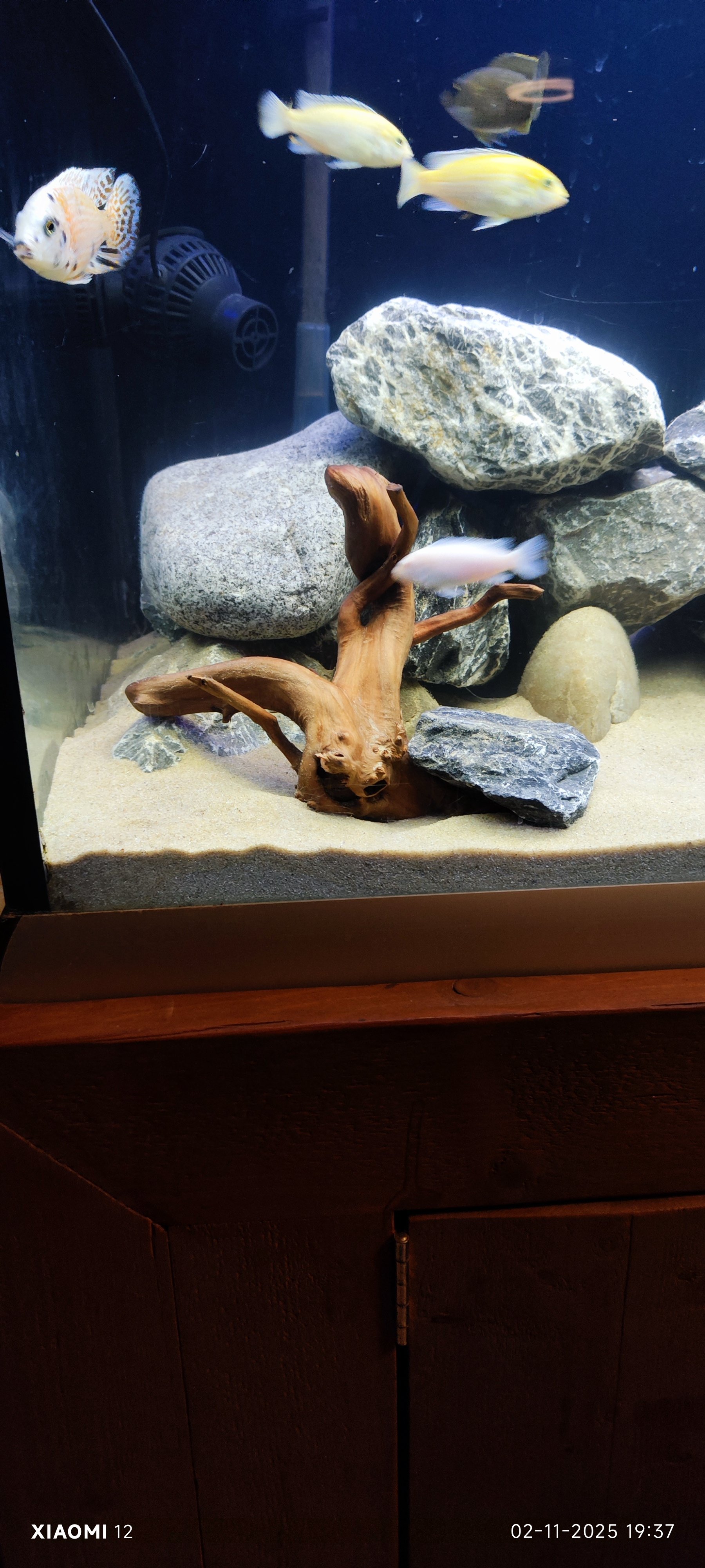 Daarbij gebruikt u scherpe stenen en maas keien, die laatste kan ik waarderen omdat in uw bak ook scherpe stenen liggen, en dat is in het nadeel van malawi's die elkaar niet verdragen en tussen de stenen willen verschuilen maar zich aan scherpe stenen kunnen verwonden, er zijn in de natuur maar weinig stenen die zo scherp zijn als die u gebruikt.