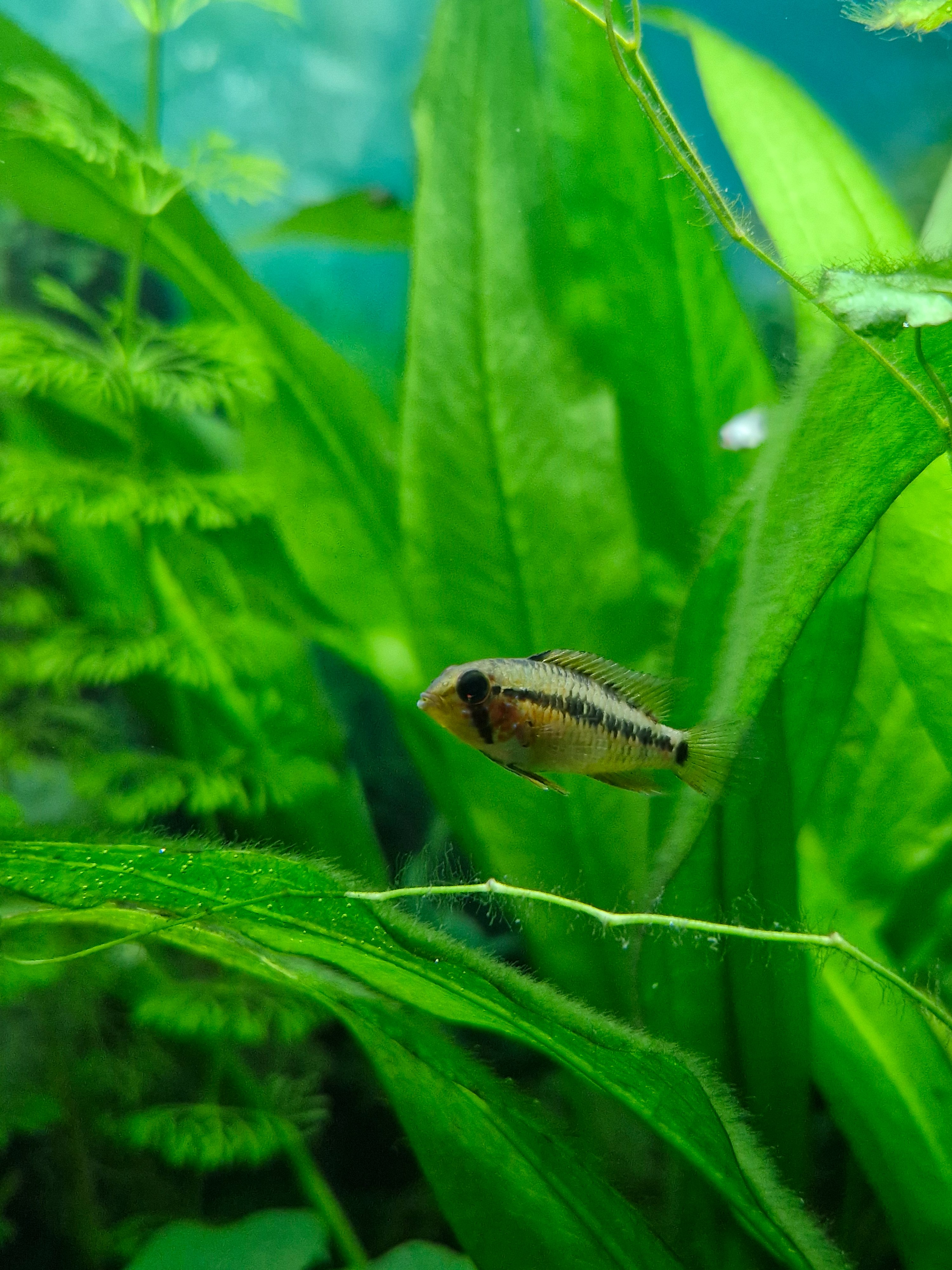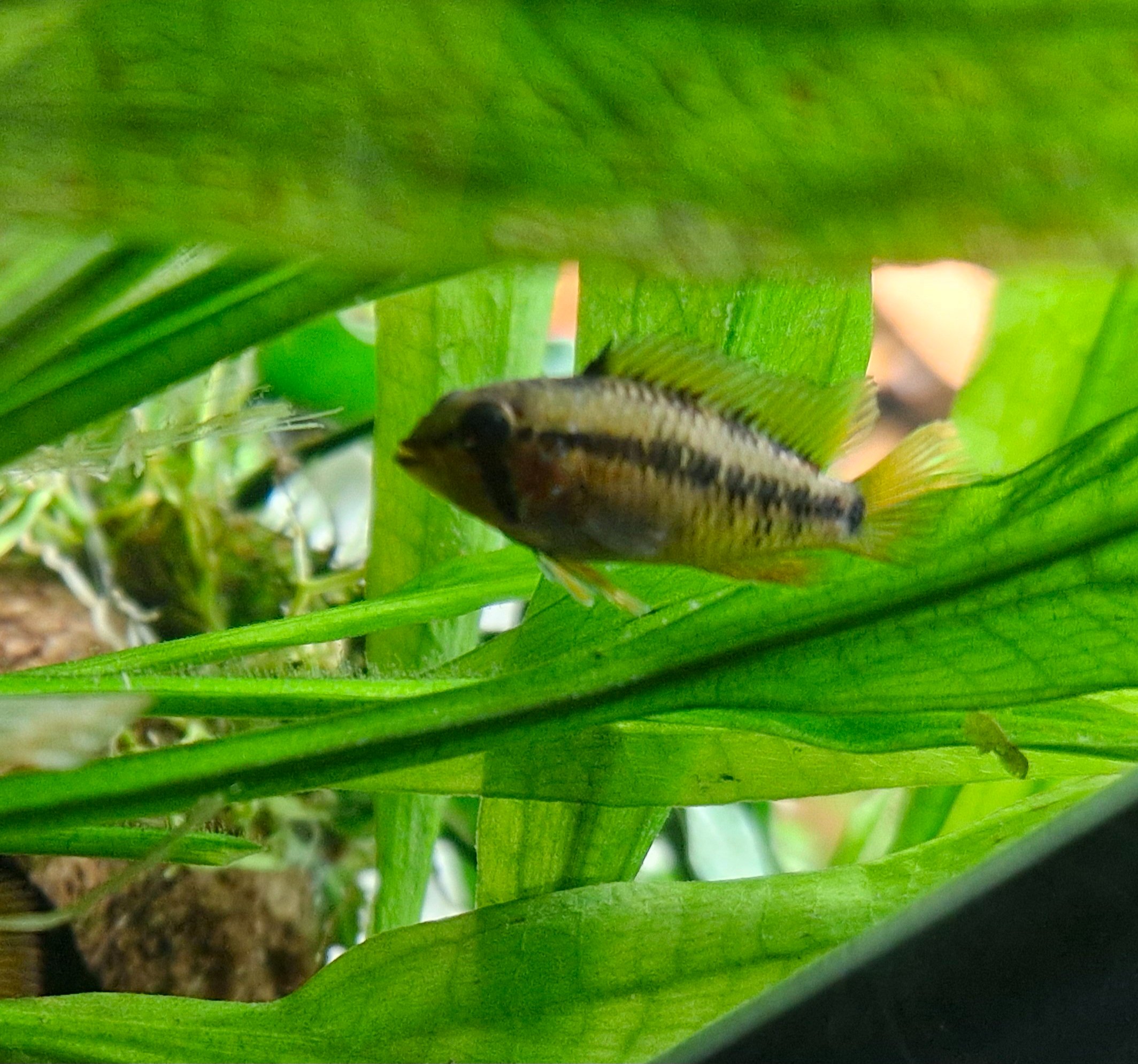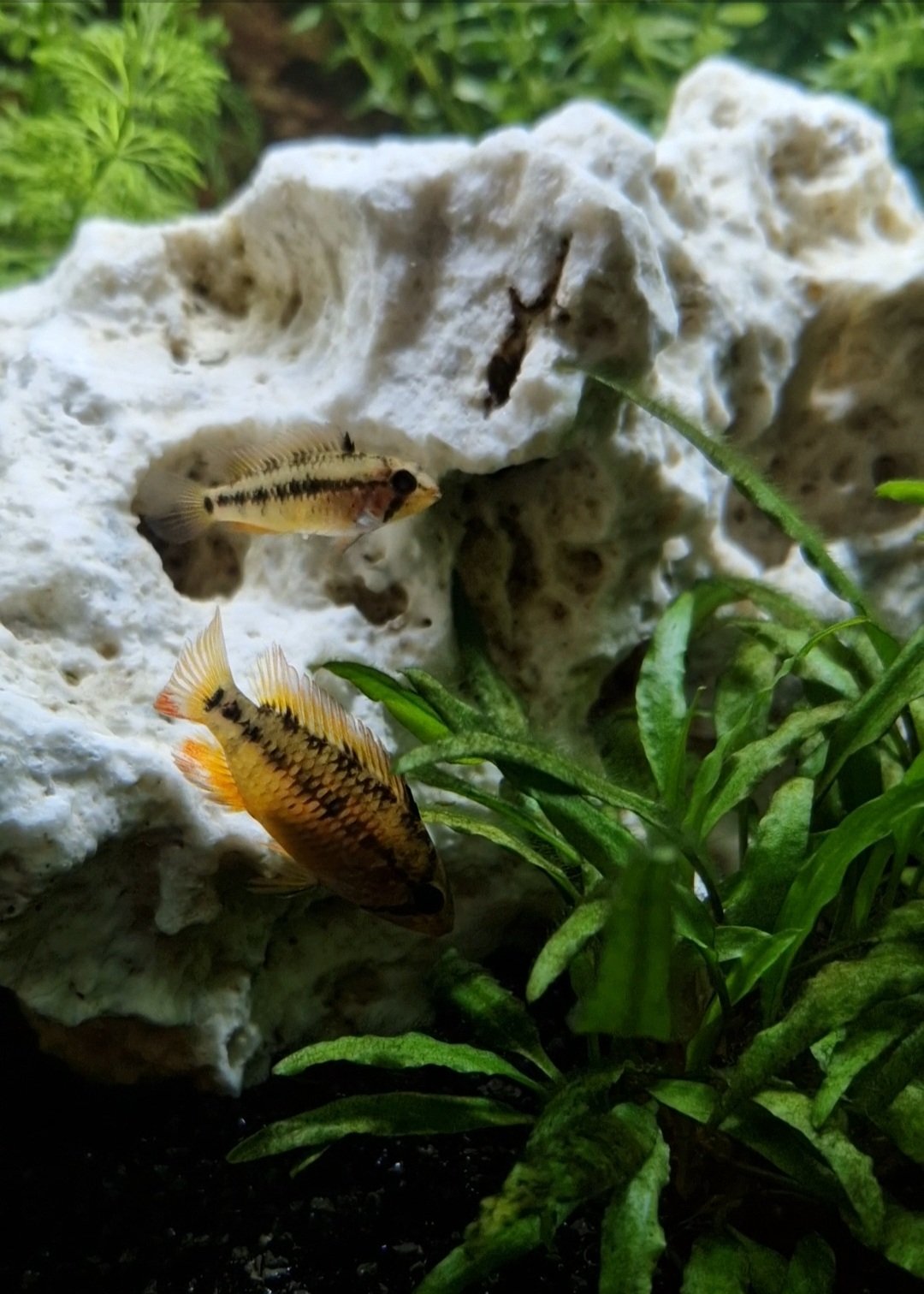 Hallo, ik heb even een vraagje. Ik heb een tijdje terug deze 2 apistogramma trifasciata gekocht. Nu heb ik erg mijn twijfels over het geslacht, is het een koppeltjes of 2 mannetjes of 2 vrouwtjes? Wie kan mij hiermee helpen? De eerste 2 foto's zijn van de ene vis, die 3 daarna van de andere vis en op de laatste foto staan ze samen.