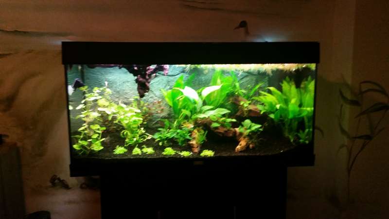 ik heb de inrichting van het aquarium een beetje aangepast, de plantjes zijn binnen en heb ze op hun plek gezet. alleen het hout wil nog niet zinken, heeft iemand tips hoe ik het hout toch op de bodem kan krijgen? hier het resultaat (sorry voor de slechte kwaliteit foto's):