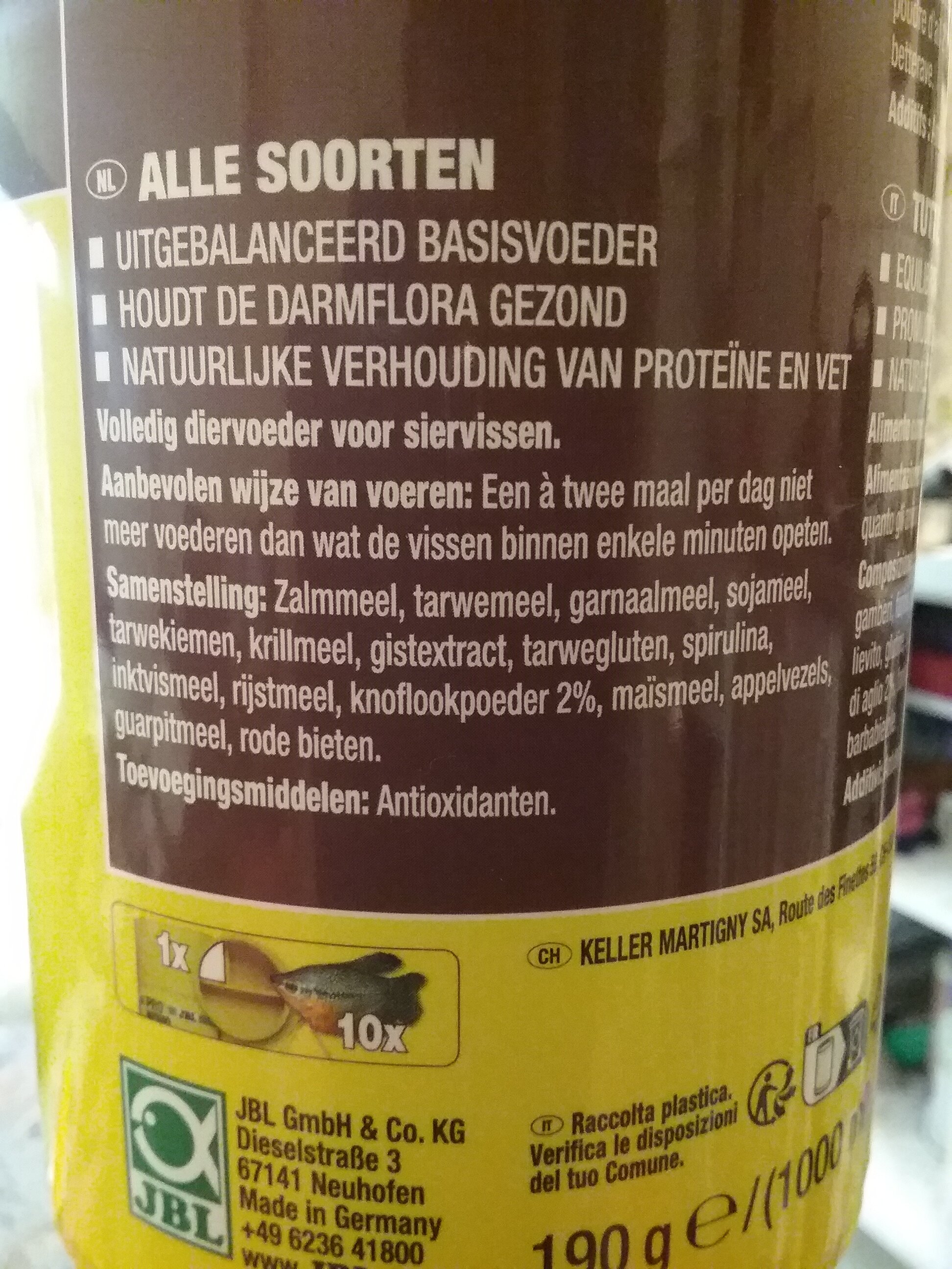 Wel heb ik gisteren ook een nieuwe pot droogvoer van jbl gekocht en moet ik zeggen dat wanneer ik de ingredienten vergelijk met een pot van tetra toen las ik dit Bekijk bijlage 364262 Bekijk bijlage 364263 en lijkt me zo de jbl een wat zuiverder voer, naast daphnia en alle soorten rondvliegende insecten.