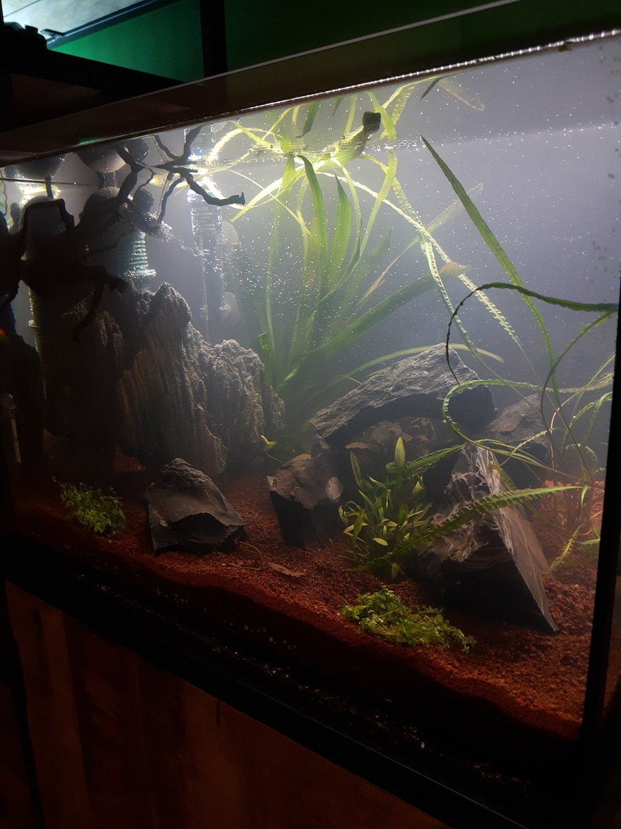 Sinds dit weekend een trotse eigenaar van mijn eerste aquarium. Nadat ik de bak schoongemaakt heb met lauw water en het grind erin gelegd heb ben ik begonnen met de planten te plaatsen.