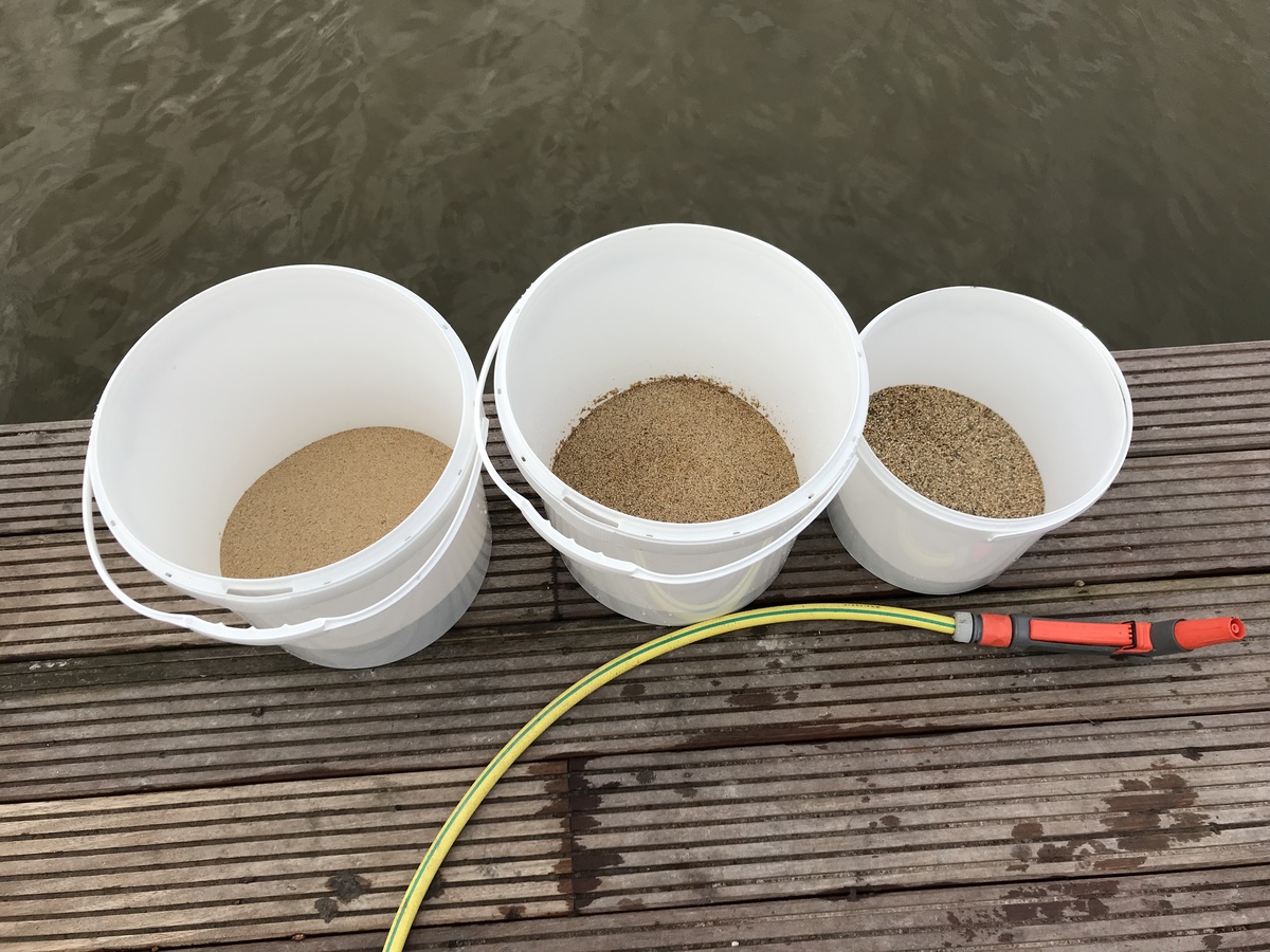 Ben erg tevreden met mijn stenen en zand. Oogt heel natuurlijk. Uiteindelijk heb ik gekozen voor 3 maten filterzand van Wildkamp. Ik heb die goed gewassen en gemengd en daar weer kiezels doorheen gemend.